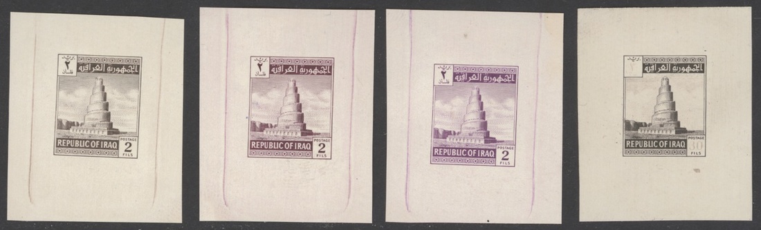 Spiral Tower of Samara 2f. (3), 30f. (value inscriptions faint), 500f. (5) die proofs on thick ungummed paper, fine