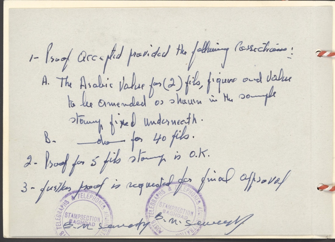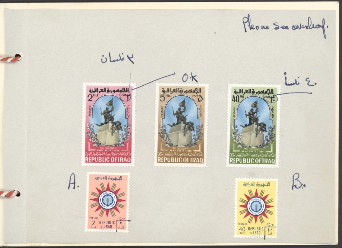 1966 45th. Anniversary of Army day, proof set from the Austrian State printers office in original folder, with annotations and samples for corrections to the Arabic value on two stamps. On reverse, notes by the Postmaster General, signed and with handstamps of the "P.T.T. Section/Baghdad". Unique. S.G. 710-712