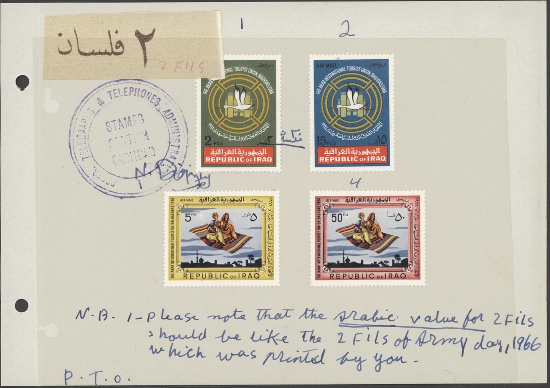 1966 Air Meeting of the Arab International Tourists Union, the set in original folder from the Austrian State Printer’s archive, with manuscript notations by the Post Master General in Baghdad regarding corrections to the 2f value. Unique. S.G. 738-741