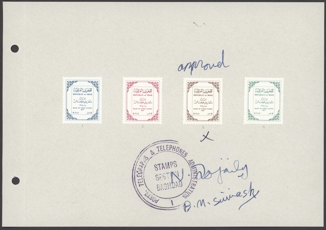 1967 Obligatory Tax 5f. in brown (marked approved), in blue, in red and in green, affixed to Austrian State Printers presentation folder; fine and unique. S.G. T763