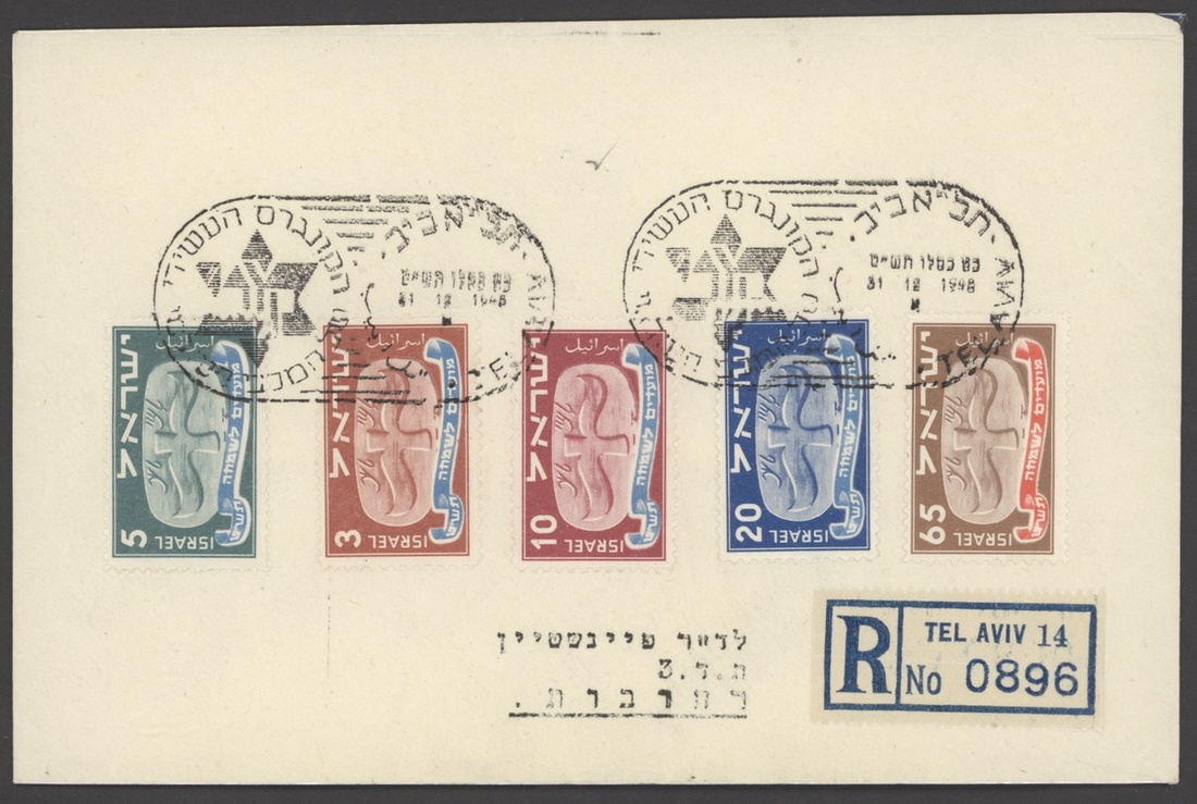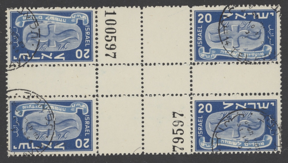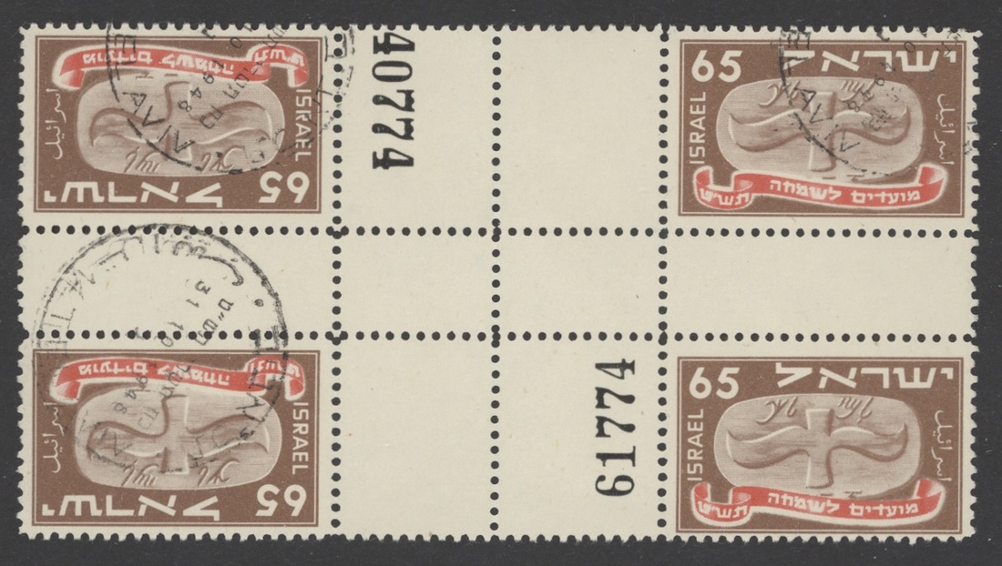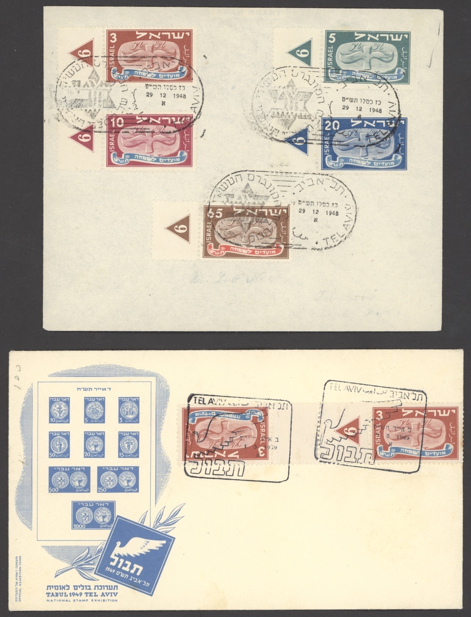 Selection, including set in tête-bêche cross gutter blocks of four, 5pr. and 65pr. tabbed singles on cover to New York, set in tête-bêche gutter pairs (65pr. imperf. gutter) on registered cover, 65pr. tab block of four with plain single on cover registered to New York, etc., chiefly fine. S.G. 10-14