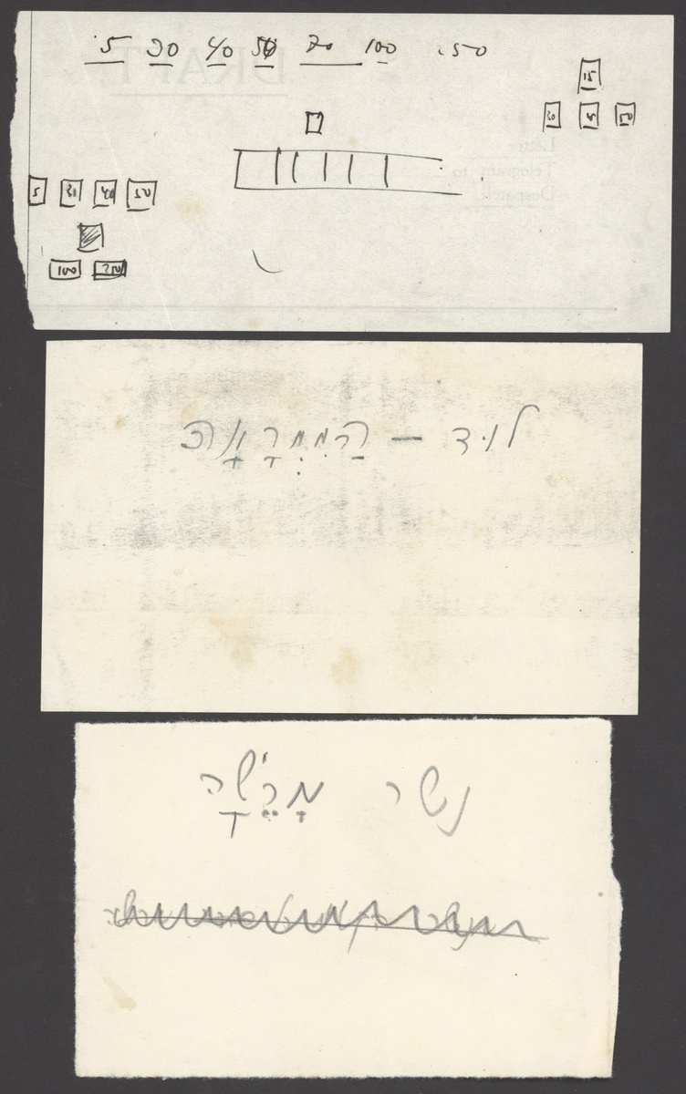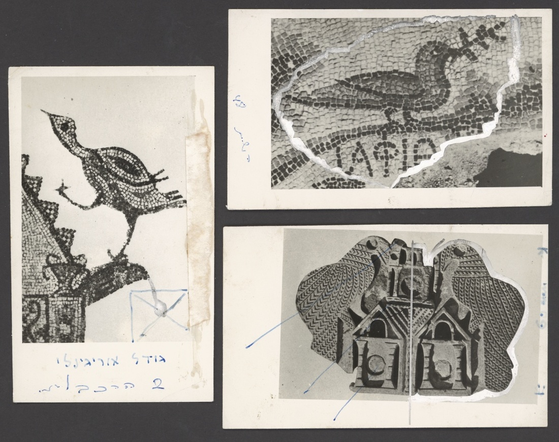 Rough sketch by O. Wallish on the reverse of a Telegram draft showing seven different values (including the unissued 70pr.) and three outlays of the stamp arrangement, also scraps inscribed (in Hebrew) "Lud Landing Strip" and "Eagle of Maresha". Muentz Certificate (1983). Also photographs of the archaeological relics as used for the 40pr., 50pr. and 250pr. with amendments in Chinese white and notes by Wallish