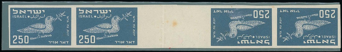250pr. grey-blue, horizontal strip of four with horizontal interpanneau margin and tête-bêche pair, unmounted mint; fold and with small stain in the margin; fine and rare. Photo