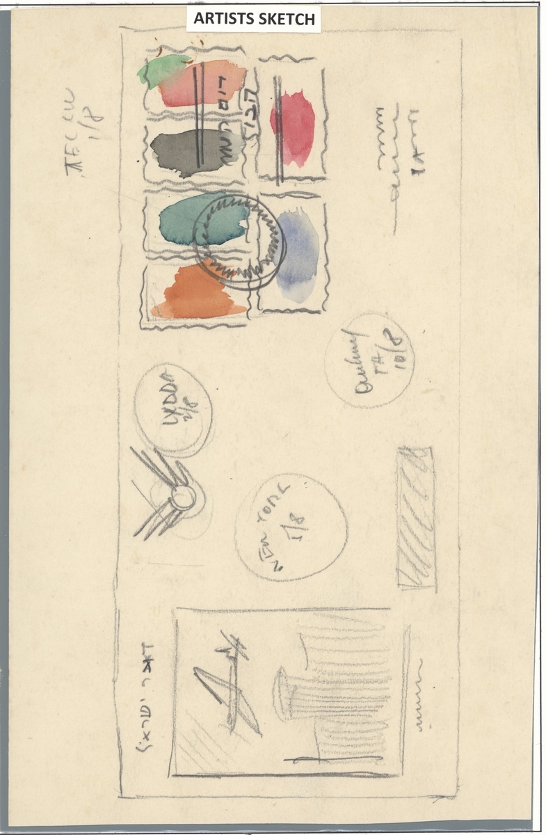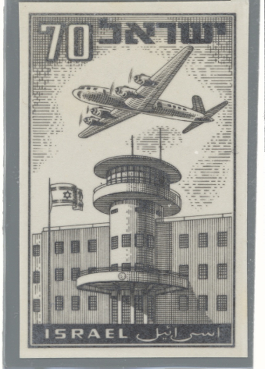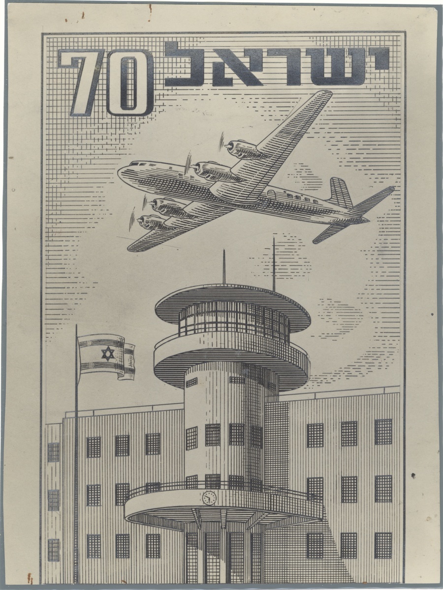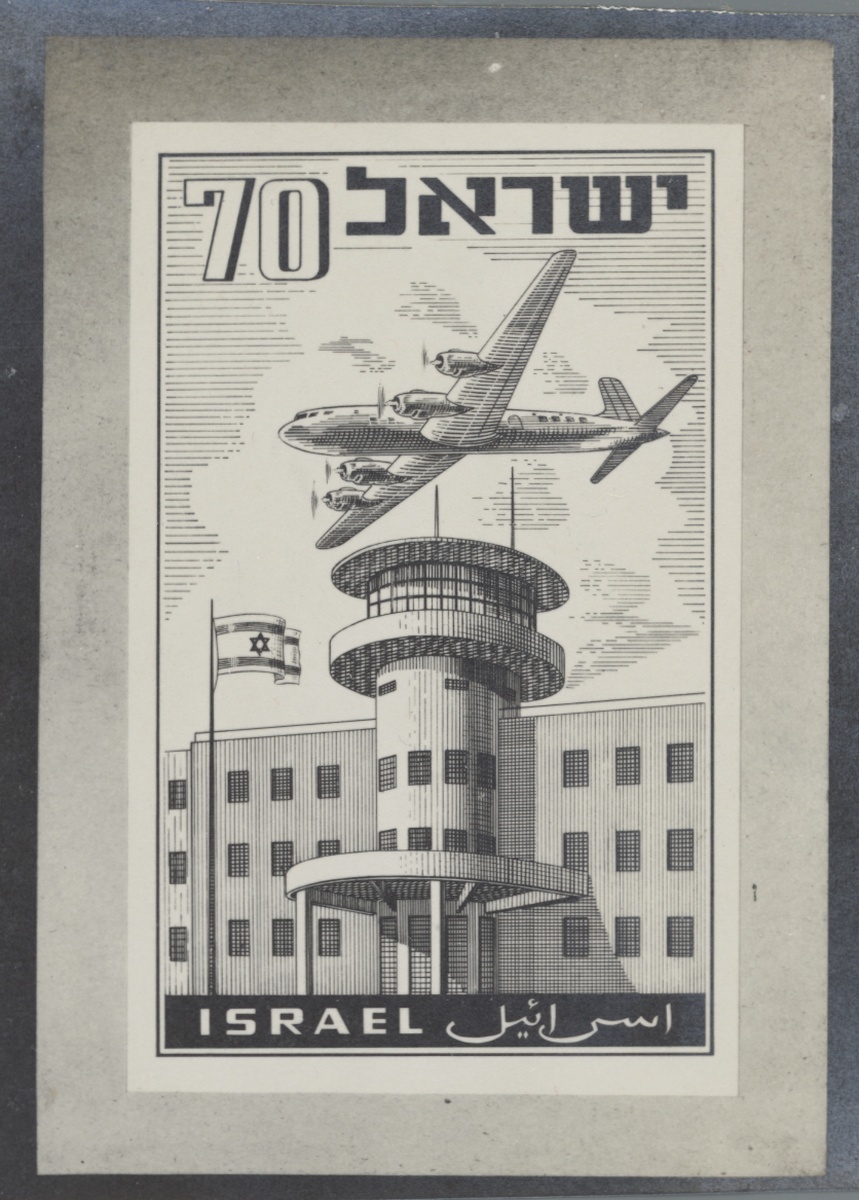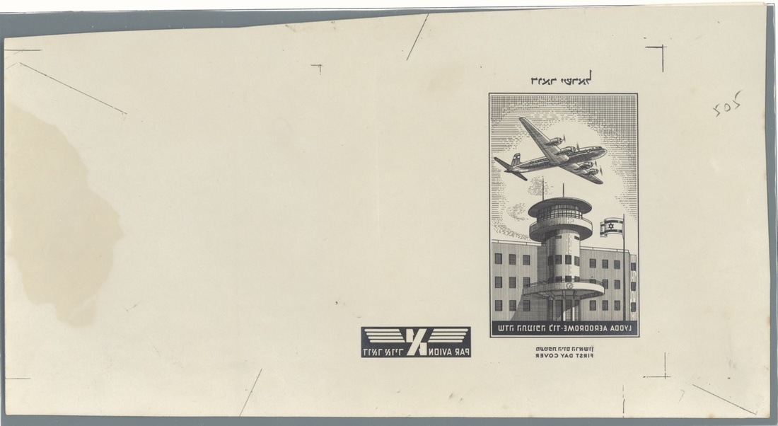 First Day Cover: Preliminary sketch on card, the stamps depicted by colour slashes and the cover outlined in pencil, photographic essays of the aeroplane and control tower (three in different sizes) and reversed photographic essay of the completed design. From the Archive of Otte Wallish