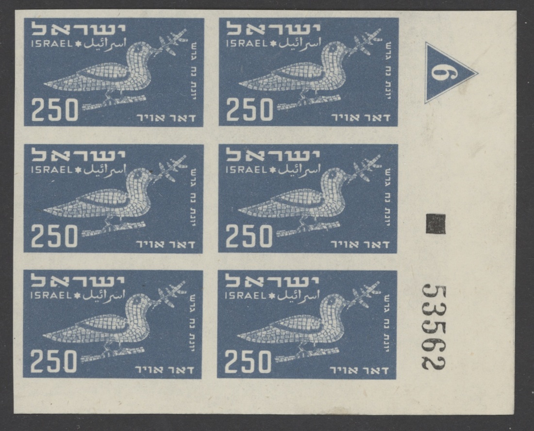 250pr. grey-blue, imperforate Plate number "6" block of six (2x3) from the lower right corner of the sheet; unused without gum; fine. S.G 37var.