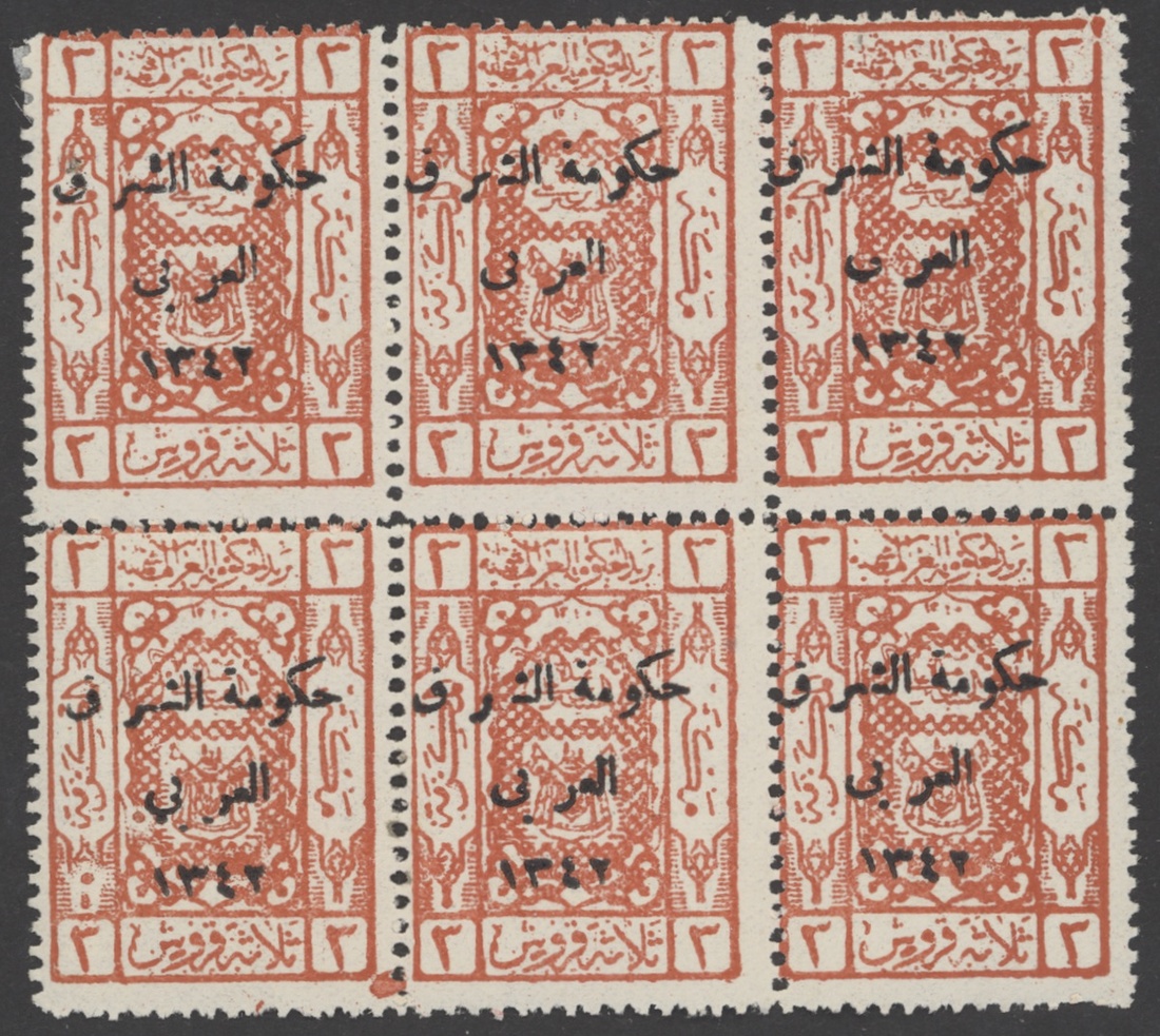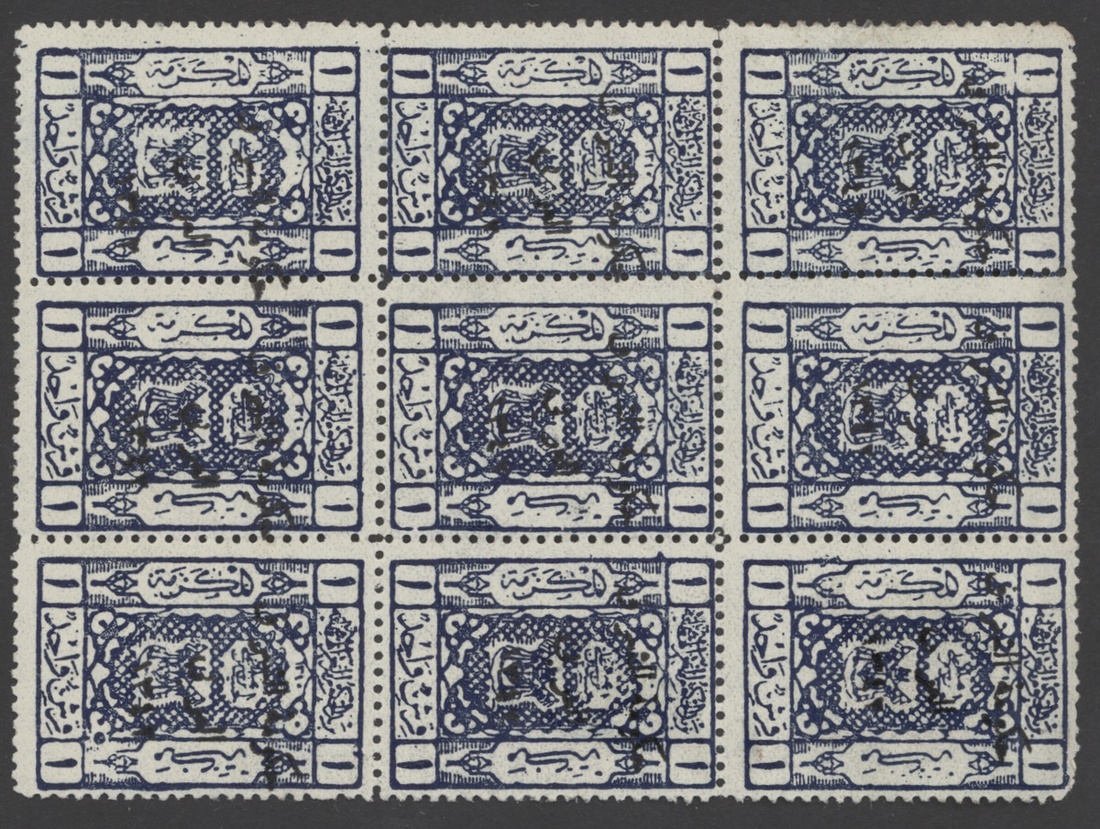 1923-24 overprints on Saudi Arabia, selection on pages (378), including 1923 (April) 1pi. (78 with blocks), 1924 (Sept.-Nov.) 1pi. (72 with blocks), 3p. (60 with blocks), etc., chiefly good to fine. S.G. 89, 91, 125, 126, 129, 132