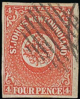 1857 4d. scarlet-vermilion with good to large margins, neatly cancelled with bars and small part datestamp; thin spot though of fine appearance. Scarce. S.G. 4, £3,500. Photo