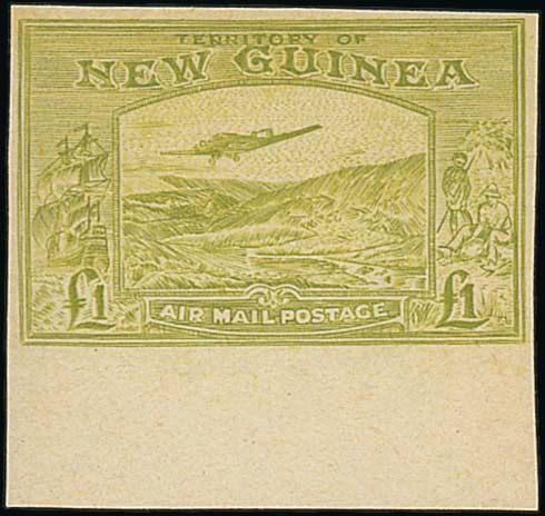 1939 Air £1 imperforate "proof" in olive-yellow, a lower left corner example, fine. Photo F