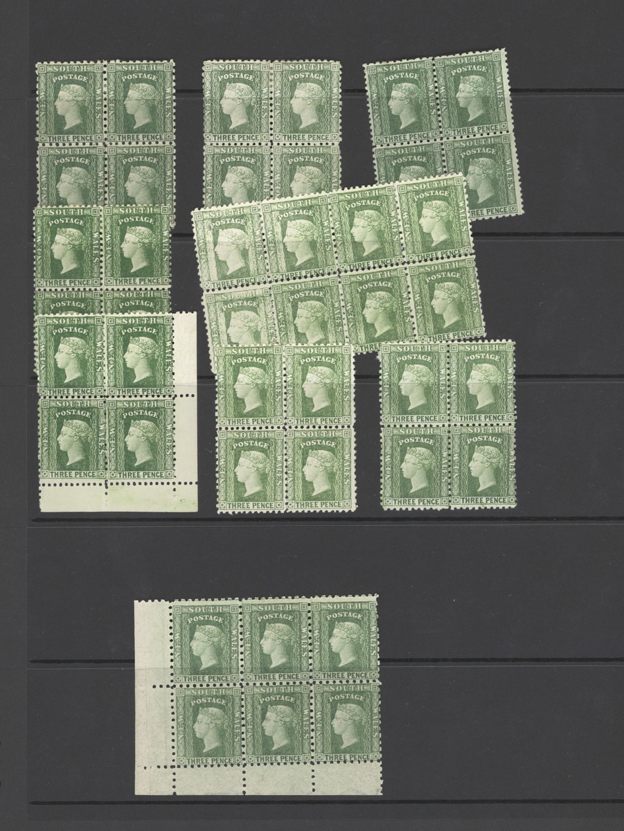 1871-1902 watermark Crown over "NSW", 3d. green, a range of shades in mint blocks (10), comprising perfs 10, 11, 10x12, 12, 12x11 (3, one a block of eight) and 11x12; also watermark "10" mint corner block of six. Fine
