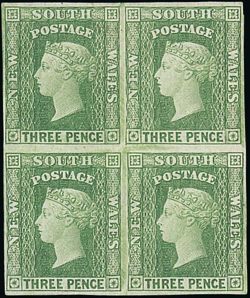 1882-97 watermark Crown over "NSW", 3d. yellow-green block of four variety imperforate, unused with large part original gum, light diagonal crease not affecting fresh and fine appearance. Scarce. B.P.A. Certificate (2010). S.G. 226g, £850. Photo