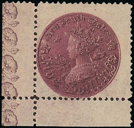 1897 Coin 5/- reddish purple, perf 12, a lower left corner example with convolvulus flowers at edge of left margin, fine mint. B.P.A. Certificate (2010). S.G. 297cd. Photo