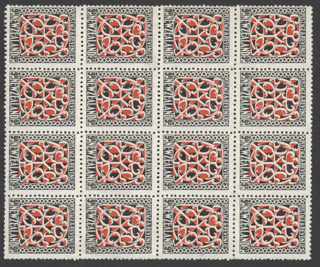 1941 small format 9d. scarlet and black block of sixteen (4x4), unmounted mint; two stamps in the bottom row with tiny gum adherences. Fine. S.G. 630, £1,520+