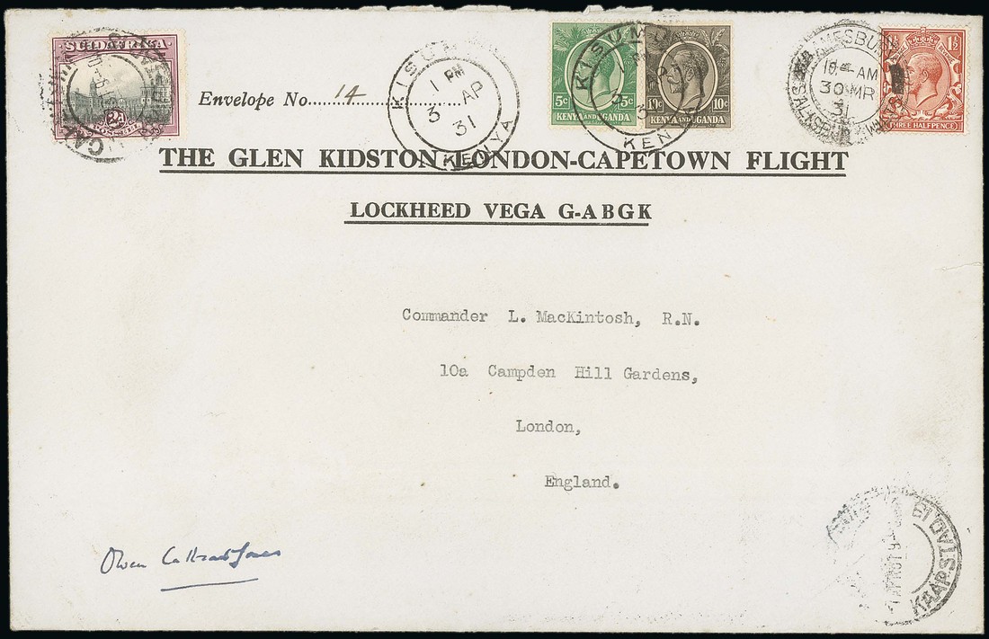 1931 (30 Mar.) specially printed envelope (214x137mm.) for the flight numbered "14" of twenty and addressed to Commander Mackintosh in London, bearing 1½d. with Amesbury datestamp, K.U.T. 5c. and 10c. cancelled at Kisumu (3.4) en route and South Africa 2d. with Cape Town datestamp (7.4) for onwards transmission, signed "Owen Cathcart Jones" (the co-pilot) and with "