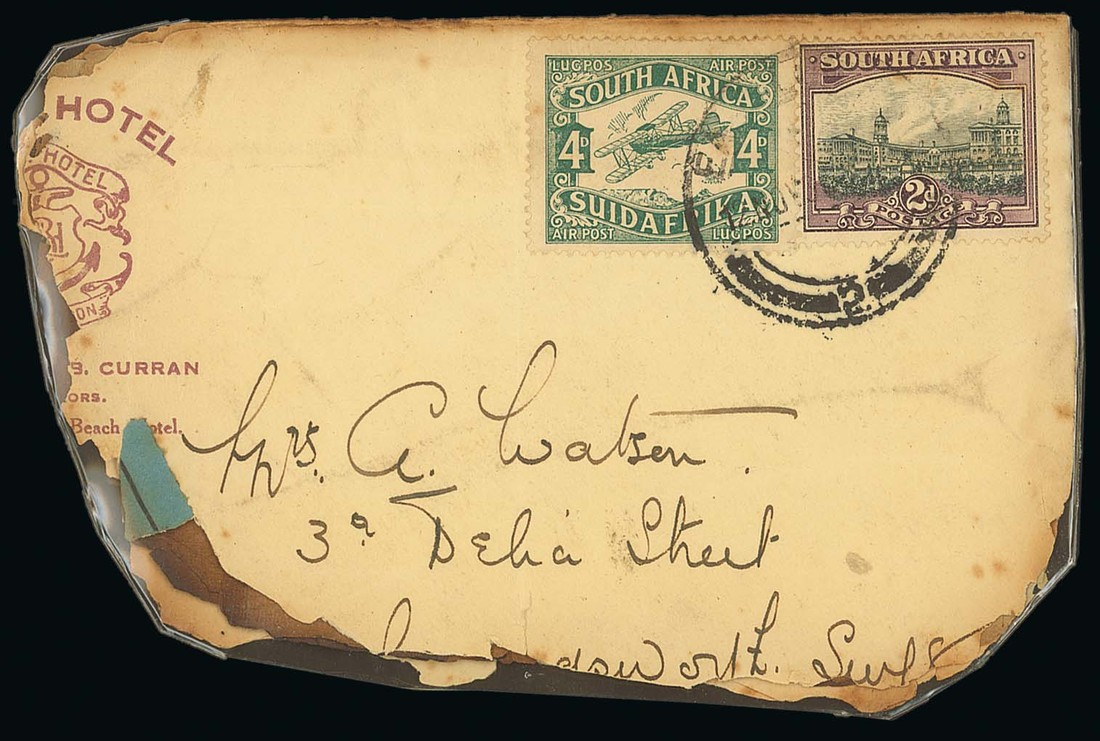 1931 (12 Nov.) charred remains of envelope from East London bearing 2d. and Air 4d., accompanied by Post Office explanatory slip for "cover and letter" and Post Office ambulance envelope with Cape Town datestamp (19.11). Rare. Nierinck 311113, type a label. Photo