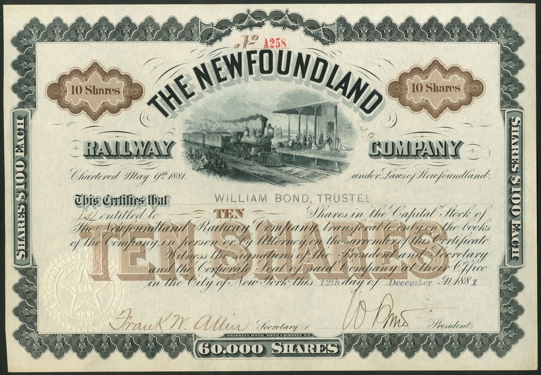 (x) Canada: Newfoundland Railway Company, certificate for 10 shares of $100, New York 188[1], #A258, attractive vignette of steam train at station, black and brown, EF.