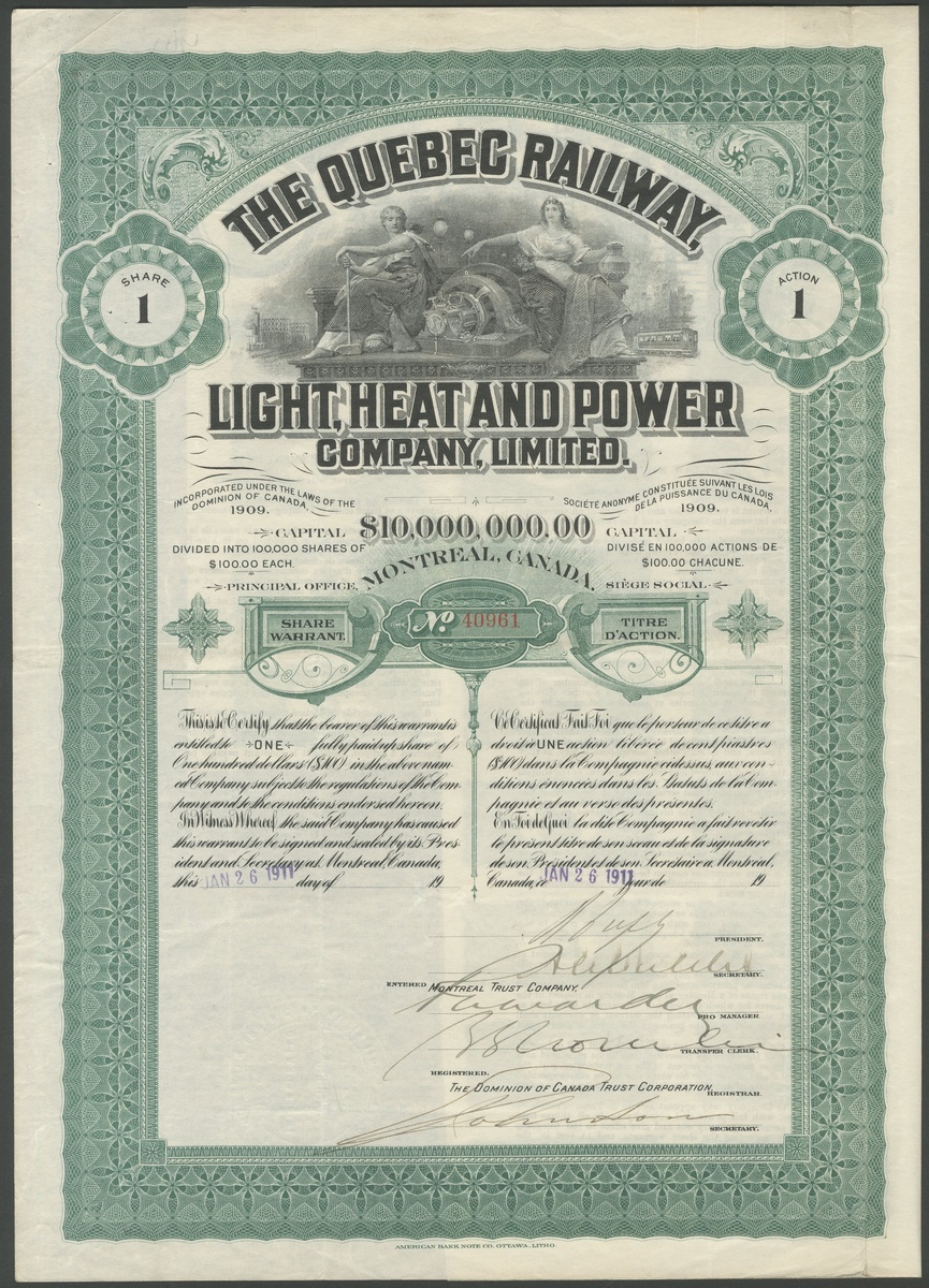 (x) Canada: Quebec Railway, Light, Heat and Power Company Limited, bearer warrant for 1 share of $100, 19[11], #40961, vignette f allegorical figures with dynamo, factories and electric tram, green, ABNCo printing, green and black, with coupons. VF.