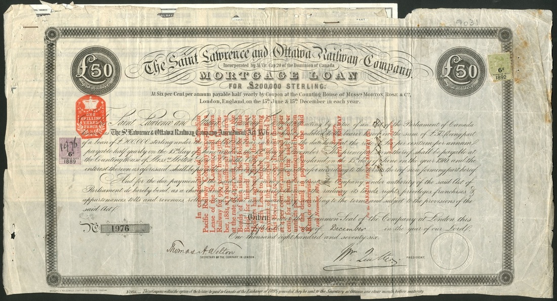 Canada: Saint Lawrence and Ottawa Railway Company, 6% Mortgage Loan, 1876, bond for £50, #1976, large format, black, with coupons from 1980. Endorsement on face reducing the interest rate to 4% subsequent to a lease of the company to the Canadian Pacific Railway for 999 years. Interest was paid on this loan until the 1990's when the Candian Pacific purchased it. Not cancelled and now scarce. Only fine.
