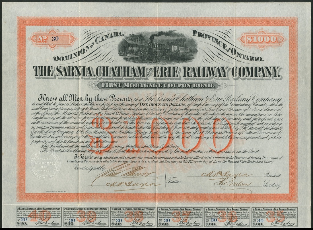 (x) Canada: Sarnia, Chatham and Erie Railway Company, Ontario, First Mortgage 6% bond for $1000, 1880, #30, of ony 600 issued, Ameruican style certificate with steam train at top, orange and black, with coupons. GVF and rare.