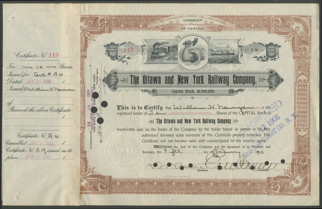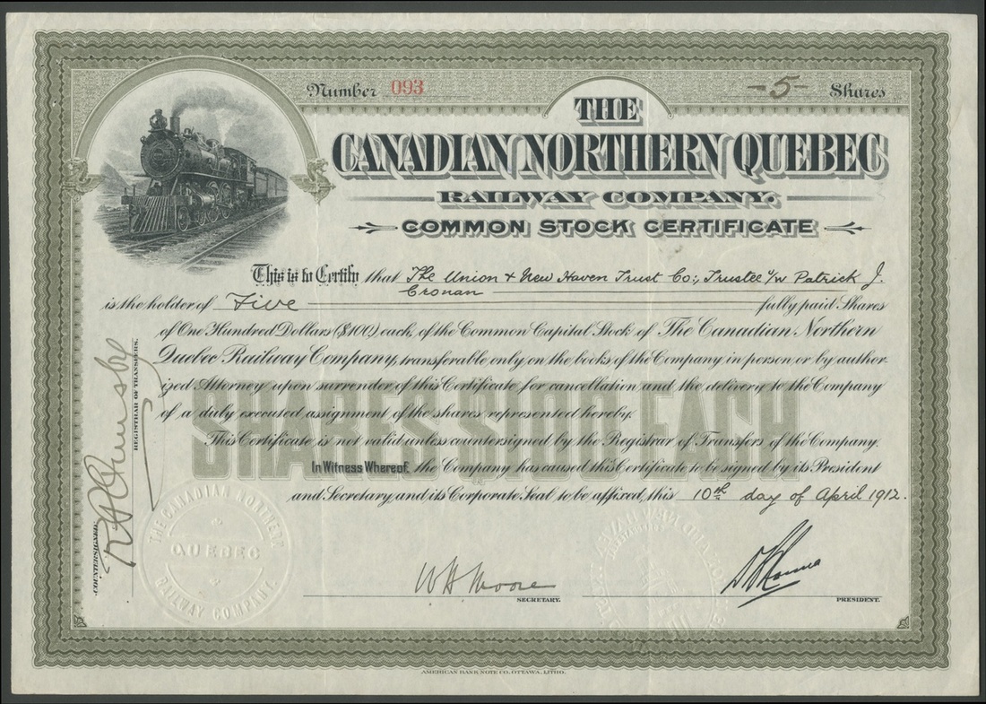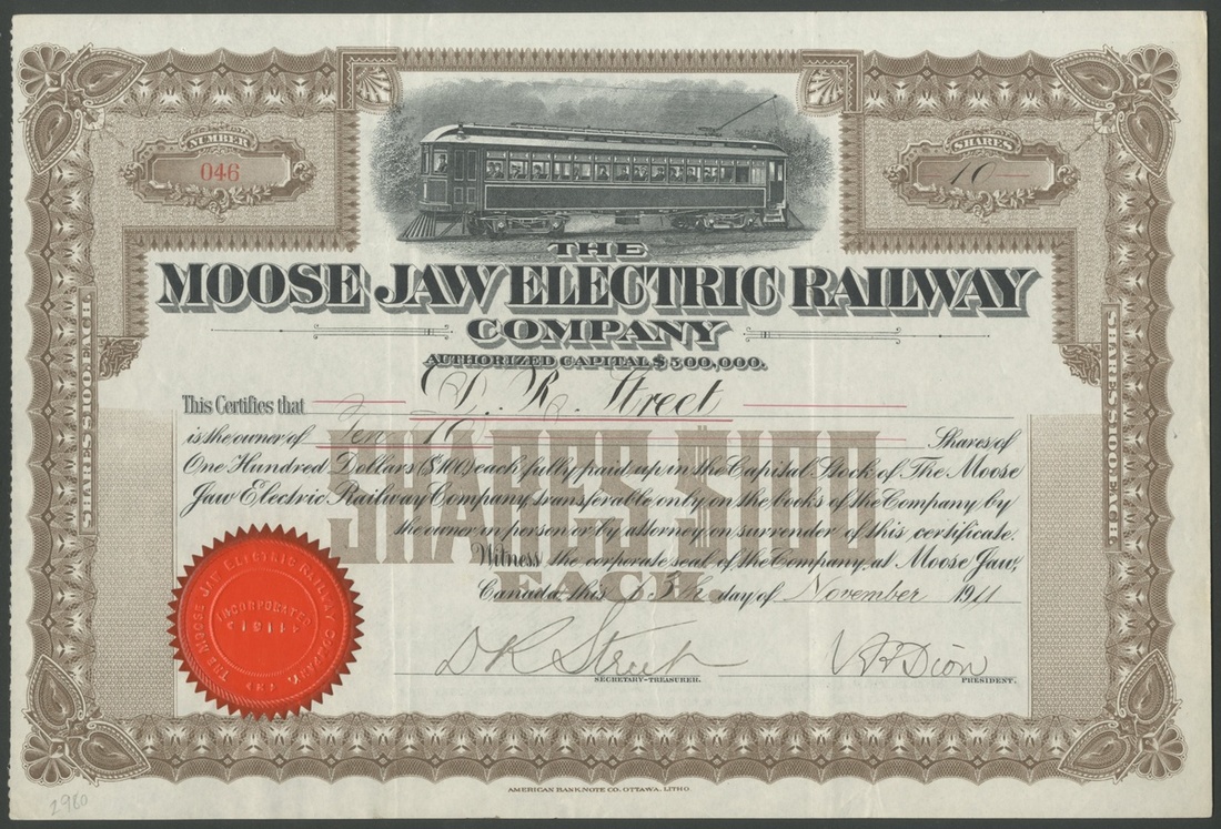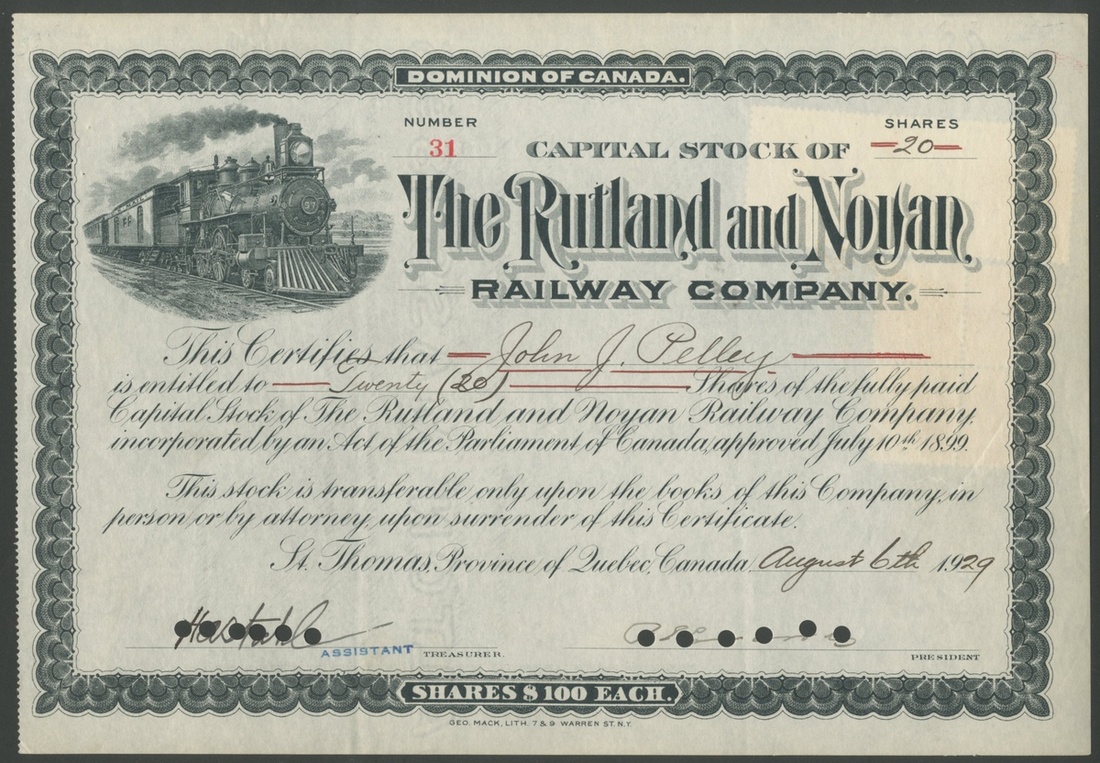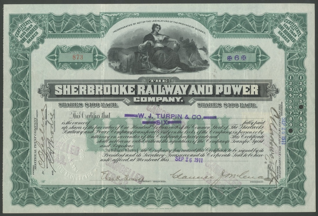 (x) Canada: A small group of railway and tramway companies, comprising Canadian Northern Quebec Railway Company, $100 shares, common stock, [1912], #093, steam train top left, green; Rutland & Noyan Railway Company, $100 shares, 19[29], #31, steam train left, black; Moose Jaw Electric Railway Company, $100 shares, 19[11], 046, electric tram in centre, brown; St.Lawrence and Adirondack Railway Co., $100 shares, 19[01], #A10, steam train by river top centre, red, cancelled and reglued to stub; Ottawa and New York Railway Co., shares, 18[905], #A19, steam train and steam ship with arm and hammer in centre, brown, cancelled and reglued to stub, and, Sherbrooke Railway and Power Company, common stock, [1911], #873, allegorical figure, green, canceled. All VF and better (6).