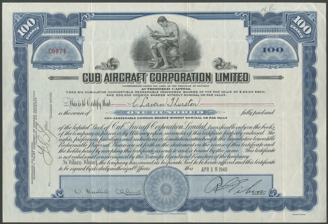 (x) Canada: Cub Aircraft Corporation Ltd., 100 shares, common stock, [1940], #C0074, allegorical male seated with passenger aircraft, blue. Established at Hamilton, Ontario in 1937, originally to manufacture Piper Cubs under the name "Cub Prospector". From 1941 they also built Harlow PJC-5s. The company only survived a few years after the end ofn the war. GVF and scarce.