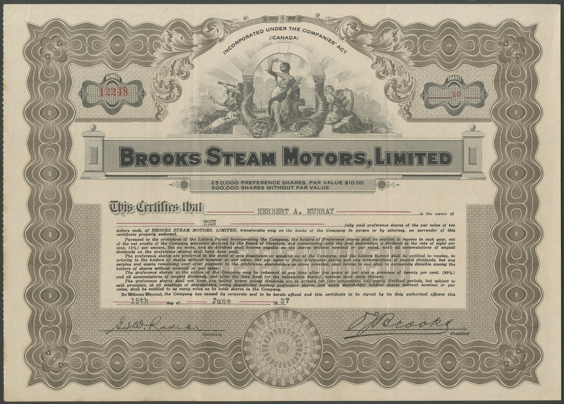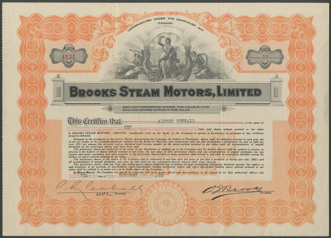 (x) Canada; Brooks Steam Motors Ltd., a good pair of certificates for preferred shares, 19[27], #12248, and common stock, 19[25], #4131, orange, allegorical figures at top, ornate borders, brown and orange respectively. Trifolded otherwise EF (2).