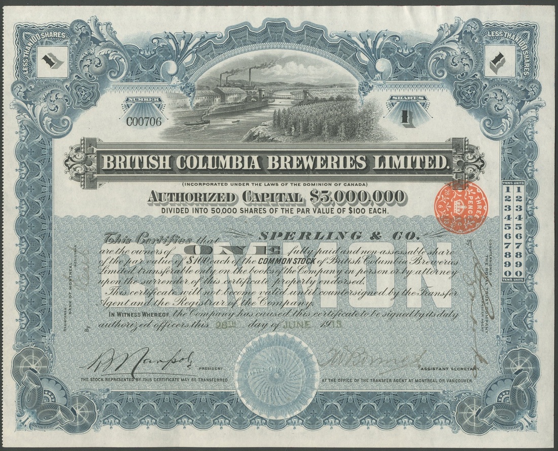 (x) Canada: British Columbia Breweries Ltd., 1 share of $100, 19[13], #C00706, lovely vignette of brewery, river and bridge, ornate border, blue and black, no printer's imprint but certainly of Waterlow or Bradbury quality, English duty stamp. EF.