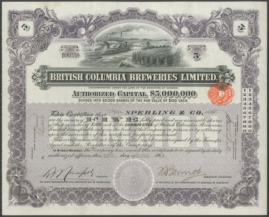 (x) Canada: British Columbia Breweries Ltd., 5 shares of $100, 19[13], #B00509, lovely vignette of brewery, river and bridge, ornate border, mauve and black, no printer's imprint but certainly of Waterlow or Bradbury quality, English duty stamp. EF.