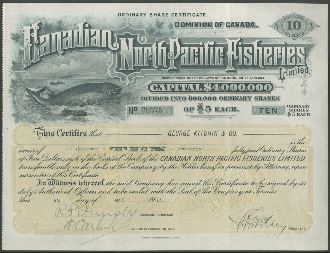 (x) Canadian North Pacific Fisheries Ltd., 10 shares of $5, 19[11], #C0375, lovely vignette of beached whale with steam vessel and rowing boat, dark blue-green, yellow underprint, printed by Waterlow & Sons. GVF.
