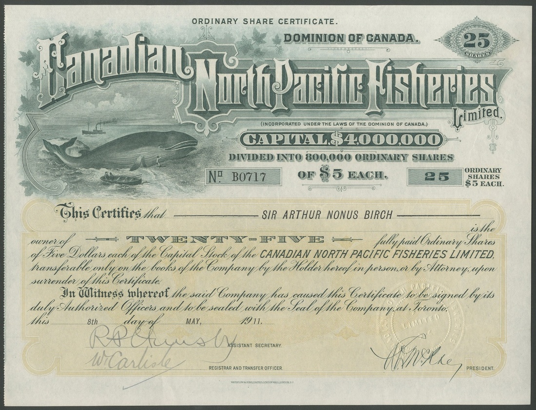 (x) Canadian North Pacific Fisheries Ltd., 25 shares of $5, 19[11], #B0717, lovely vignette of beached whale with steam vessel and rowing boat, dark blue-green, yellow underprint, printed by Waterlow & Sons. GVF.