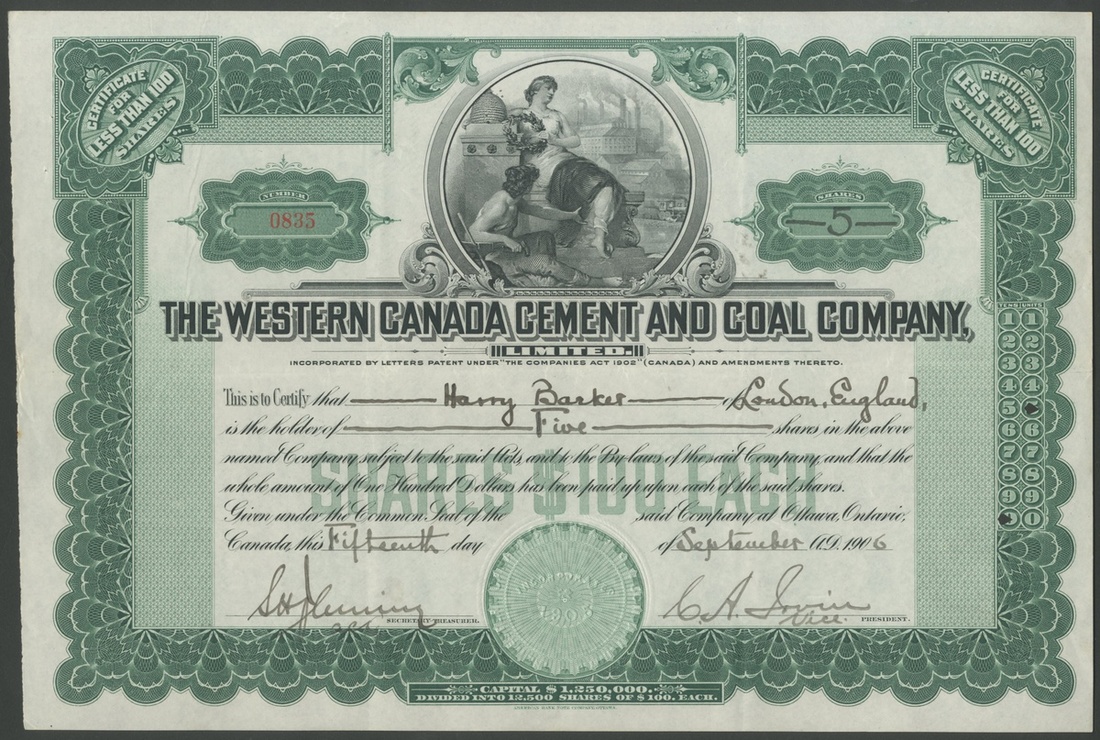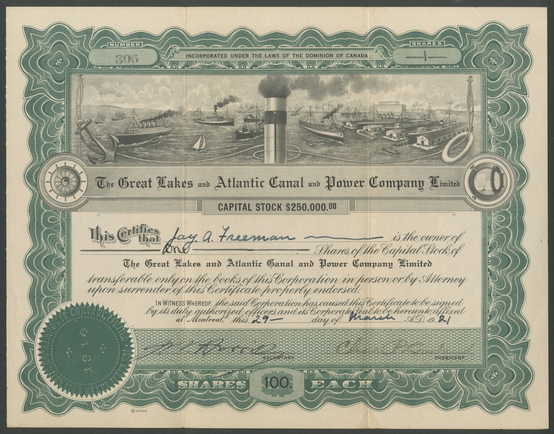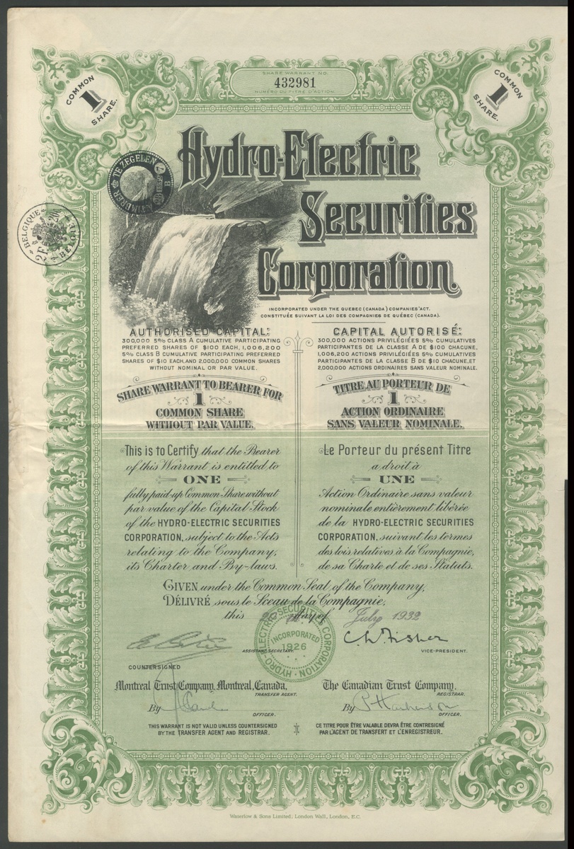 (x) Canada: Hydro-Electric Securities Corporation, 1 common share, [1932], #432981, waterfall at left, green and black, printed by Waterlow & Sons, with coupons; together with Great Lakes and Atlantic Canal and Power Company Limited, $100 shares, 19[21], #306, shipping at top, green, Goes printing, and, Western Canada Cement and Coal Company Ltd., less than 100 shares, 190[6], #0835, green.