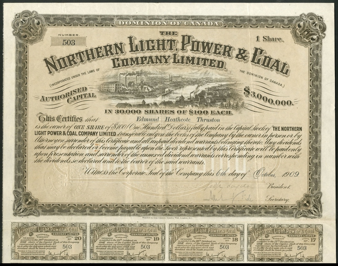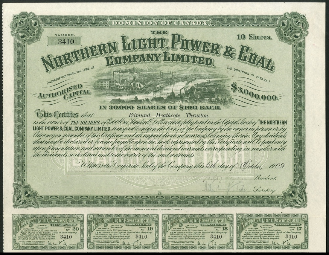 (x) Canada: Northern Light, Power & Coal Company Limited, a group of certificates comprising 1 share, #503, 5 shares, #1737 and 10 shares, #3410, all 1909, together with First Mortgage 5% Gold Bonds for $100, #474 and $1000, #1903, these large format, all with attractive vignette of river and factories, printed by Waterlow & Sons, all with coupons. VF-EF (5).