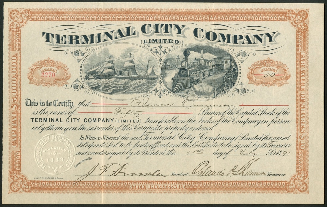 (x) Canada: Terminal City Company Limited, $10 shares, 18[91], #2270, steam ship and steam train at top, orange-brown, printed in Boston. Chartered by the Parliament of Nova Scotia for promoting the eastern terminus of the Strait of Canso. It owned 3046 acres of land and 6 miles of water frontage, also 1522 acres on the Island of Cape Breton and water frontage on Caribou Cove. Also coal mines at Caribou Cove. VF and rare.