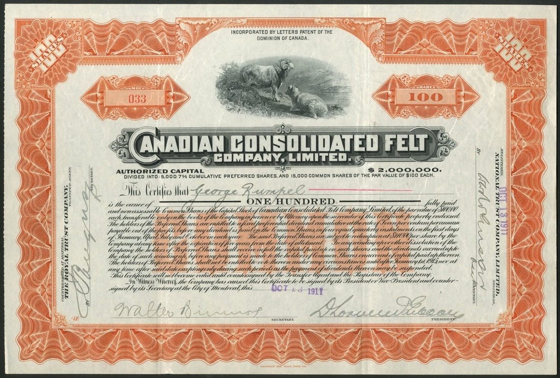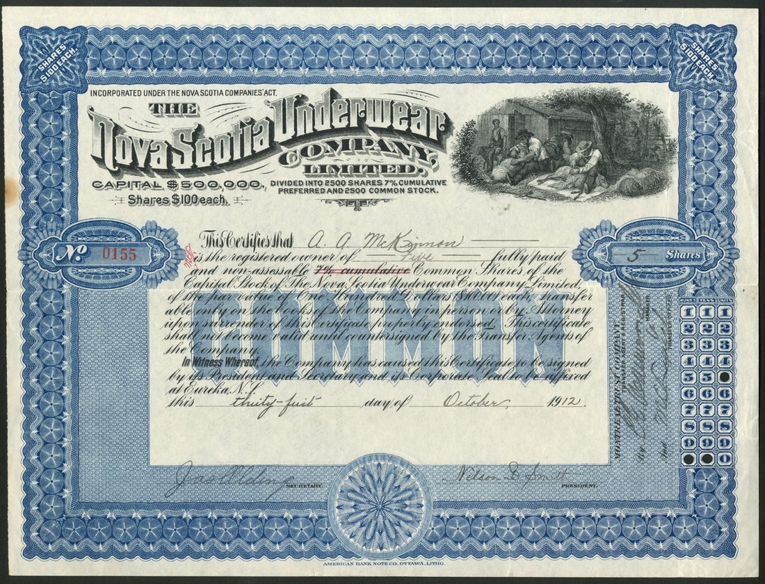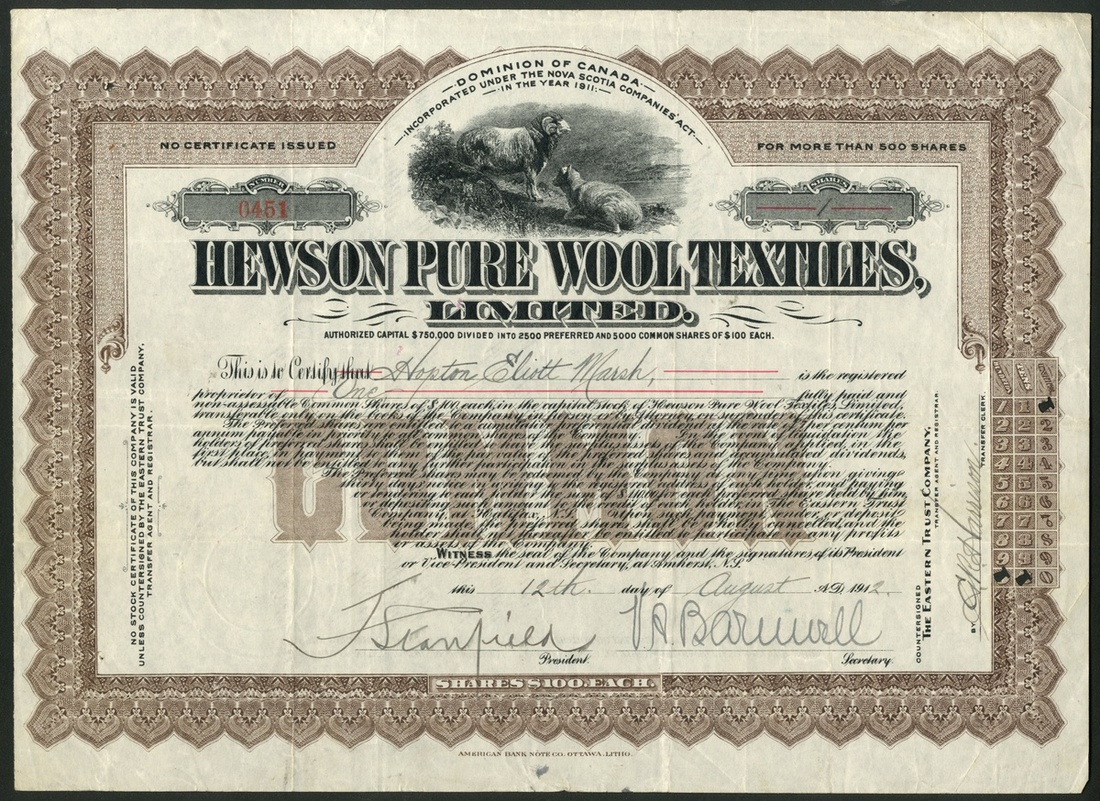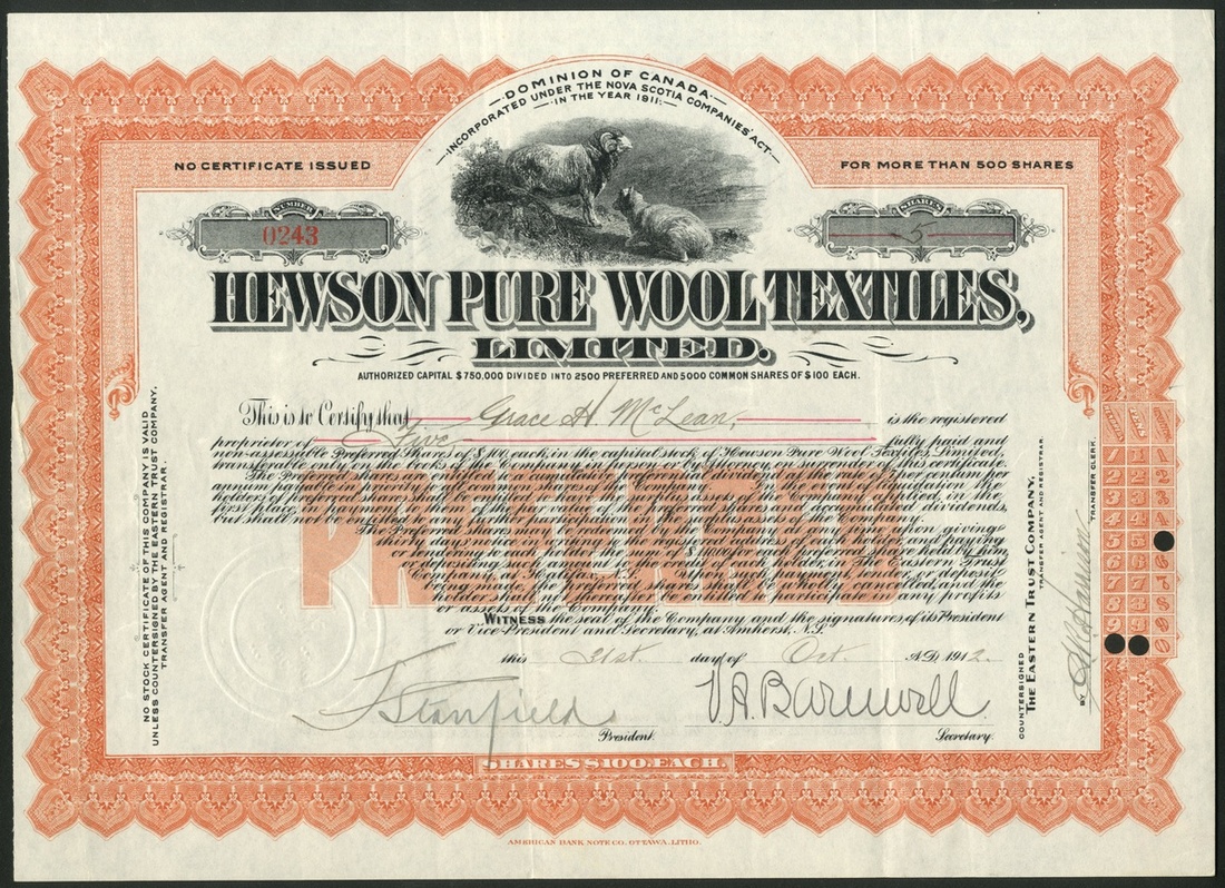 (x) Canada: A small group of wool companies, comprising Nova Scotia Underwear Co. Ltd., common stock, 19[12], #0155, blue and preferred stock, 19[12], #0172, brown, sheep shearing at top right; Hewson Pure Wool Textiles Ltd., common stock, 191[2], #0451, brown and preferred stock, 191[2], #0243, orange, sheep grazing at top, and, Canadian Consolidated Felt Co. Ltd., common stock, [1911], #033, orange, sheep grazing at top. Mostly VF or better, all scarce (5).