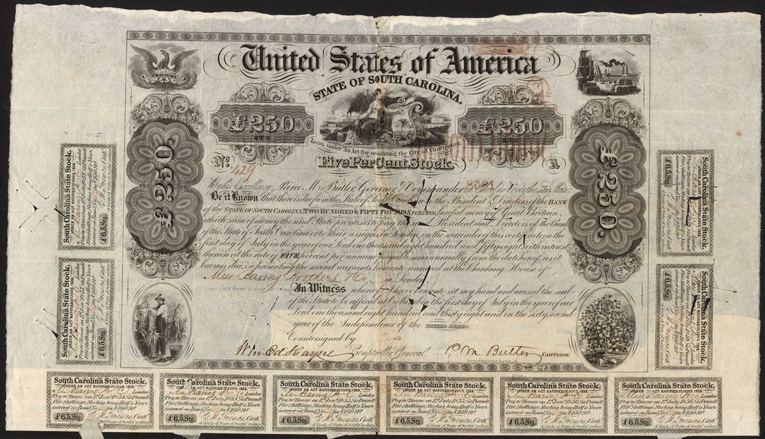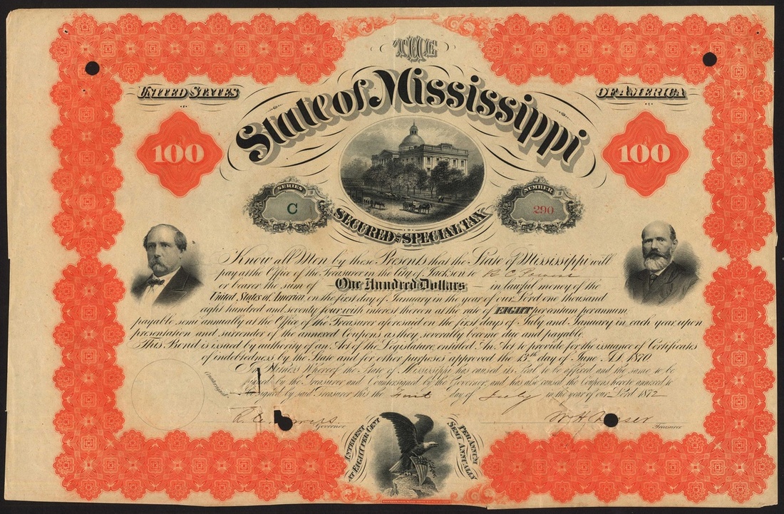 USA: State of South Carolina, 5% Stock, 1838, bonds for £250, numerous vignettes, one with coupons, the other all trimmed away, cut cancelled; together with State of Mississippi, 8% Loan, $100, 187[2], #C290, ornate border, Governor Alcorn at left, unidentified man at right (Criswell 70J). Heavily trimmed, cut and hole cancelled but otherwise GVF and scarce; State of North Carolina, 3 different $1000 bonds, 1869, issued to aid various railroads in the State, attractive vignettes, and other Southern bonds (3). Mixed condition, Fair to F (9).