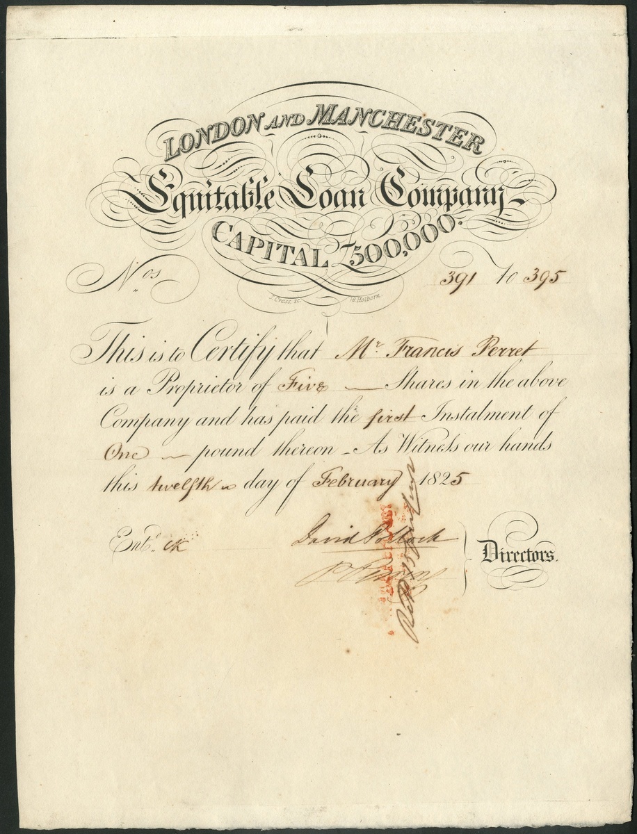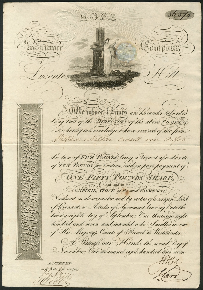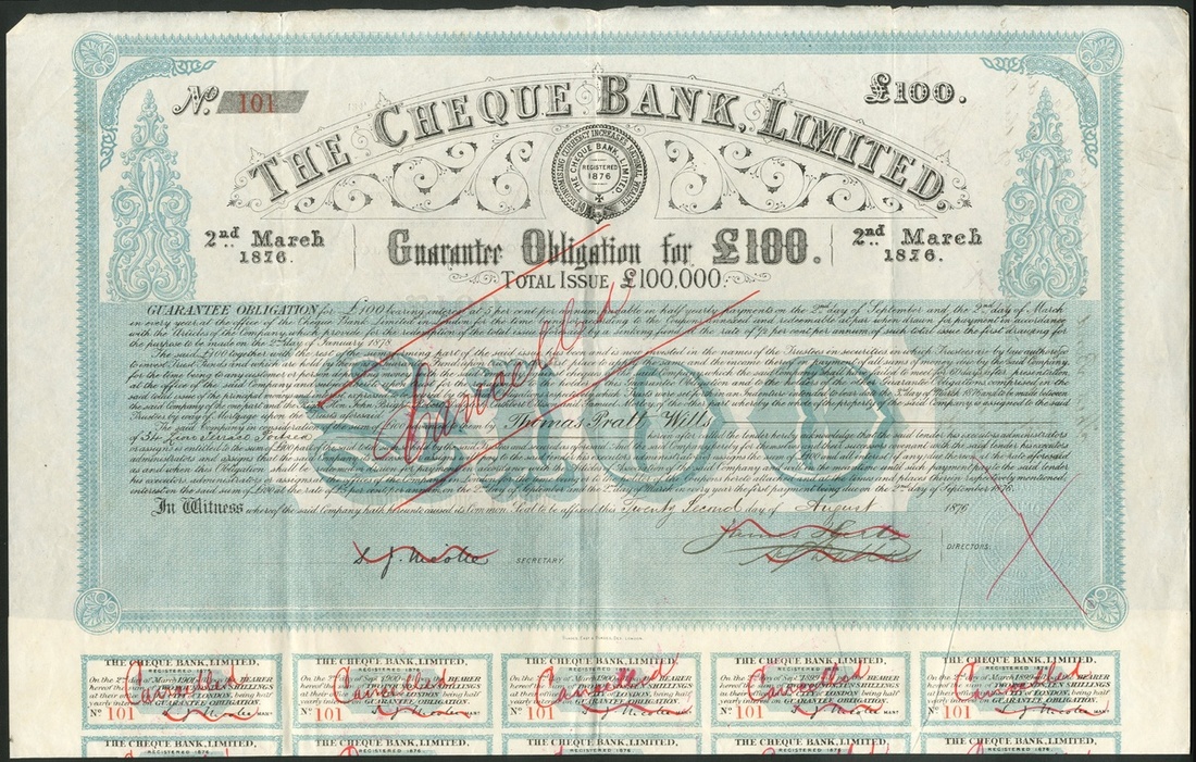 An accumulation of Banking and Finance certificates, comprising Hope Insurance Company, £50 share, 1807; Farmers & General Fire & Life Insurance and Loan & Annuity Co., 1842 and 1850; County Fire Office, 1821; London & Manchester Equitable Loan Co., 1825, 2 examples; London & Northern Bank Ltd., 1899; Overend Gurney & Co., 1865; Cheque Bank, £100 bonds, 2 examples, and other Engish and Foreign pieces including Banque Fonciere de Wilno, 1926, 1000 zloty and Hambros Investment Trust, 1957, printed by Waterlow. Mixed condition F-VF (26).