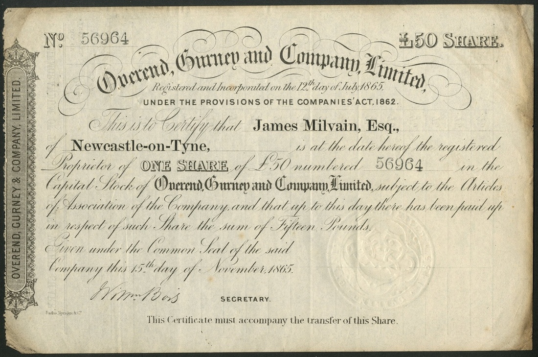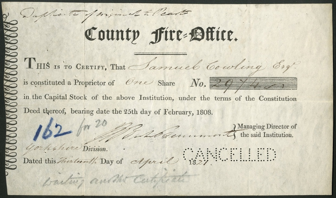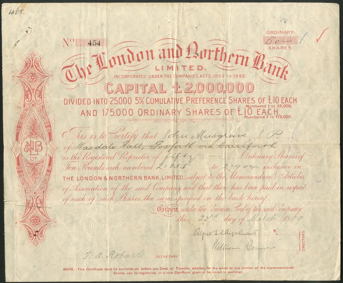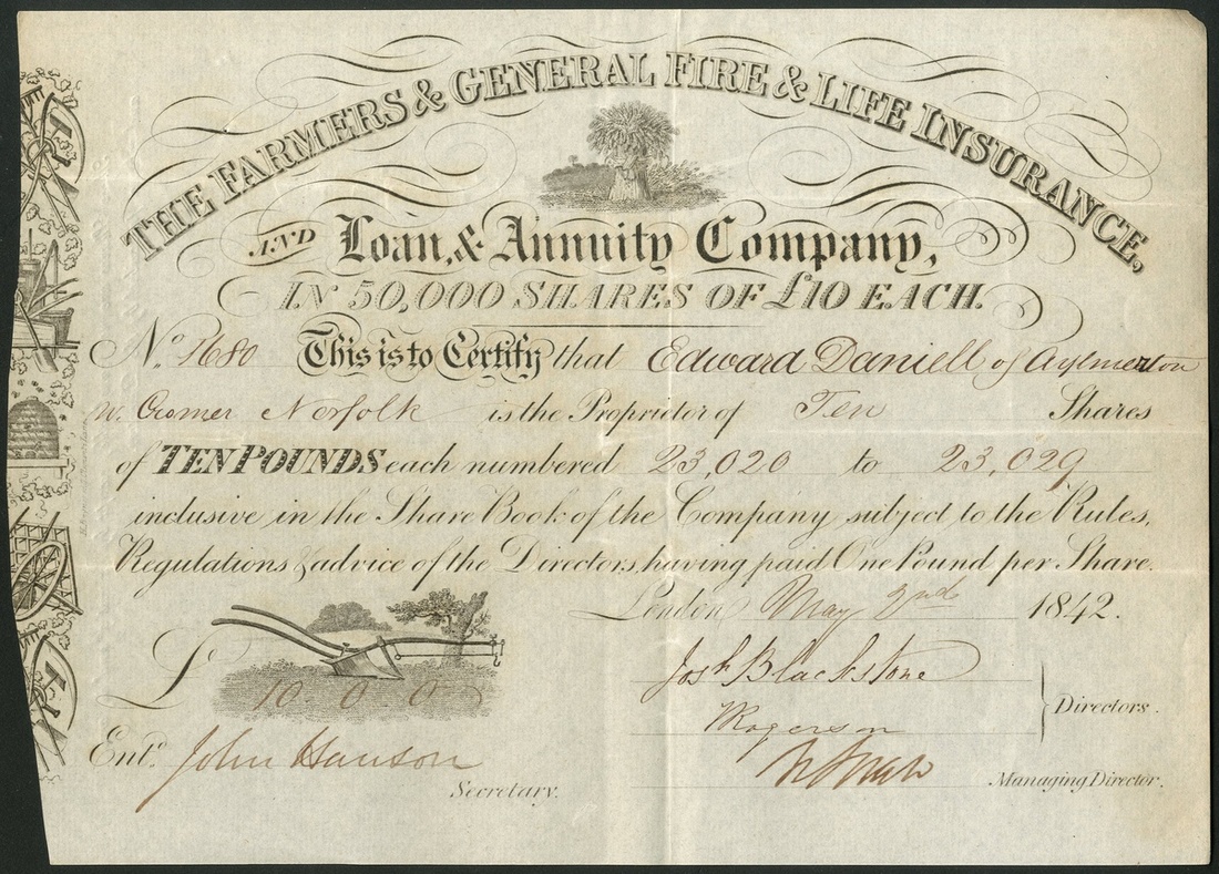 An accumulation of Banking and Finance certificates, comprising Hope Insurance Company, £50 share, 1807; Farmers & General Fire & Life Insurance and Loan & Annuity Co., 1842 and 1850; County Fire Office, 1821; London & Manchester Equitable Loan Co., 1825, 2 examples; London & Northern Bank Ltd., 1899; Overend Gurney & Co., 1865; Cheque Bank, £100 bonds, 2 examples, and other Engish and Foreign pieces including Banque Fonciere de Wilno, 1926, 1000 zloty and Hambros Investment Trust, 1957, printed by Waterlow. Mixed condition F-VF (26).