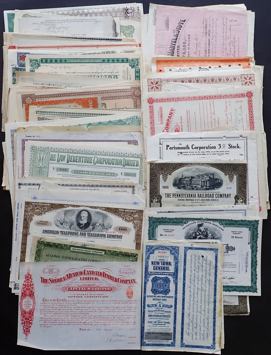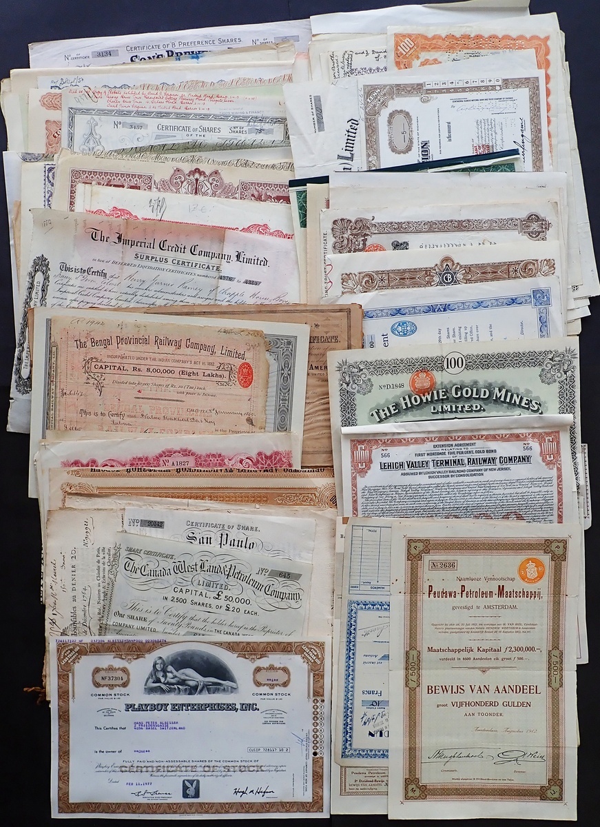 An interesting and varied accumulation of approximately 250 certificates, generally all different, with some very useful pieces including Playboy Enterprises Inc, less than 100 shares, 1977; Canada West Land & Petroleum Co. Ltd., 1866; San Paulo Brazilian Railway Co. Ltd., £20 share, 1860; A pair of French Rente, Edict of December 1764 and Conversions of 20th January 1770; Russia, Armavir Tuapse Railway, 100 rouble share; St.Petersburg Land & Mortgage Co. Ltd., £20 debenture, 1912 and Belgian Congo, L'Ikelemba, dividend share, 1898. Mixed condition but many VF and better (Approx 250).