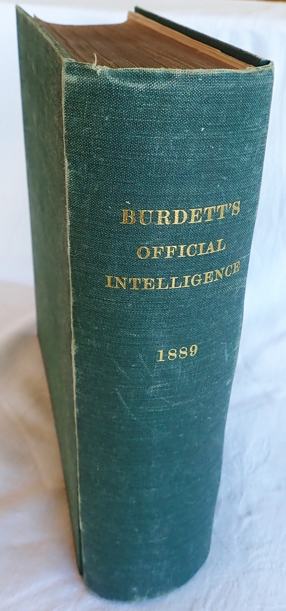 Book: Burdett's Official Intelligence for 1889, xxx + 1396 pages of information on companies quoted on the London Stock Exchange in the year, rebound in green cloth but contents in excellent condition but a few pages loose.
