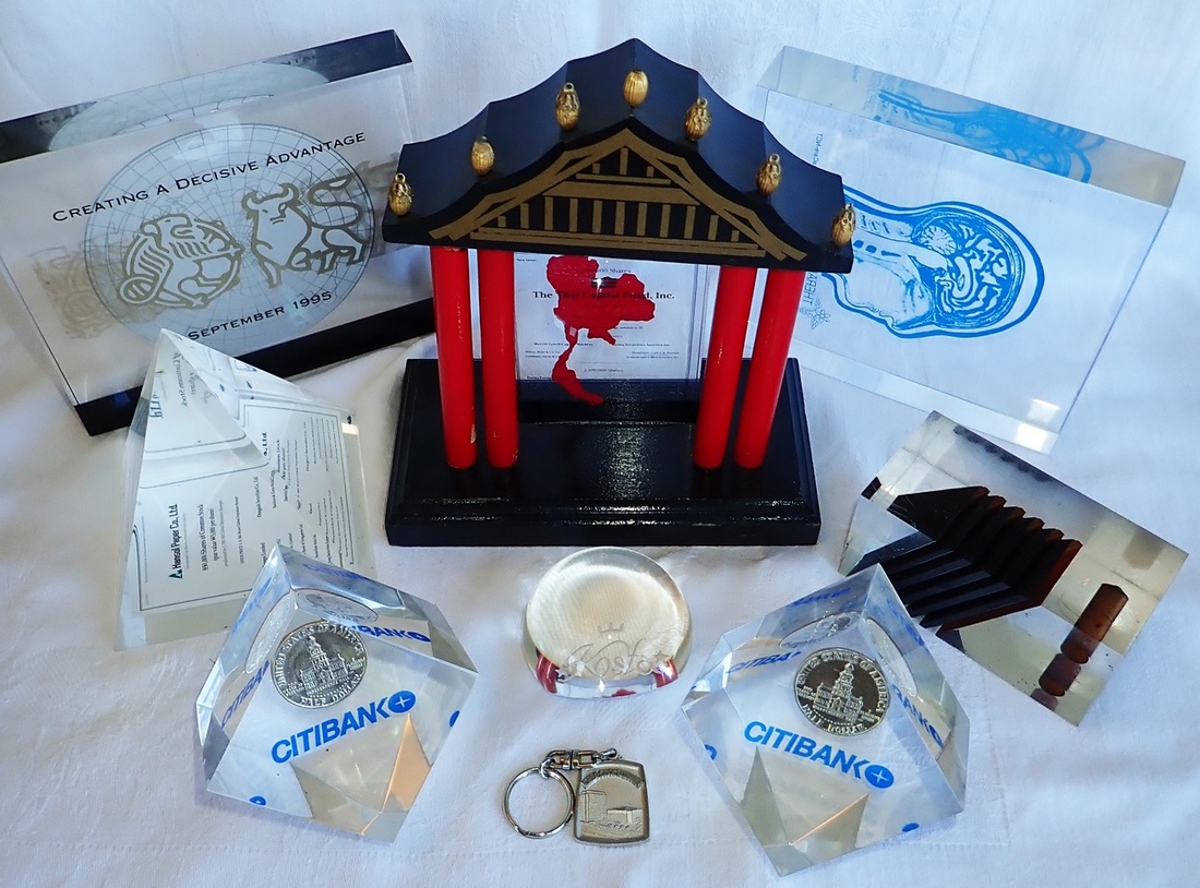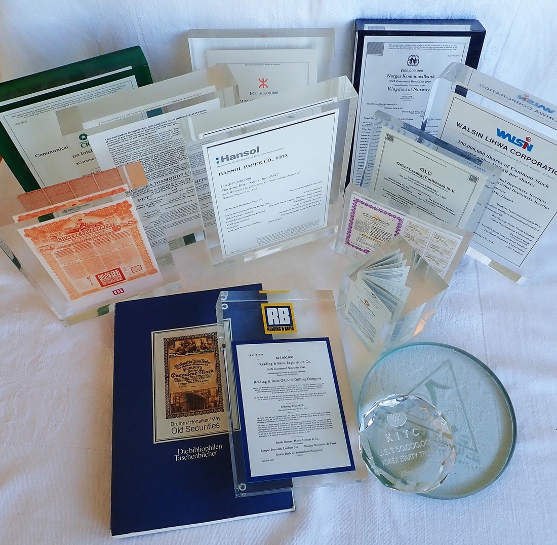 A Collection of Commemorative Perspex Plaques, relating to new issues of the 1980's. 22 examples including General Motors, Korean Stock Exchange, Thai Capital Fund, Bank of America and Citibank. Please see images for more information. Nice display pieces. (22).