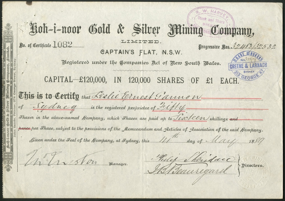 Australia: Koh-i-Noor Gold & Silver Mining Co. Ltd., Captain's Flat, New South Wales, £1 shares, 18[89], #1082, black. VF.