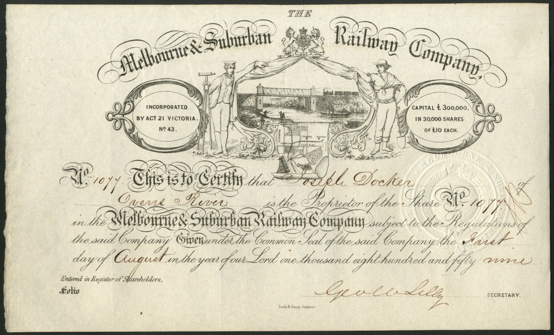 Australia: Melbourne & Suburban Railway Co., £10 share, 185[9], #1077, vignette of steam train about to cross a bridge flanked by a surveyor and a navvy, plan of the route below, black on thick paper. Built a line from Melbourne City centre to Richmond, Burley and Hawthorn, later extending to Camberwell, Lilydale and Healesville by 1889. Acquired by Government controlled Victorian Railways. EF.