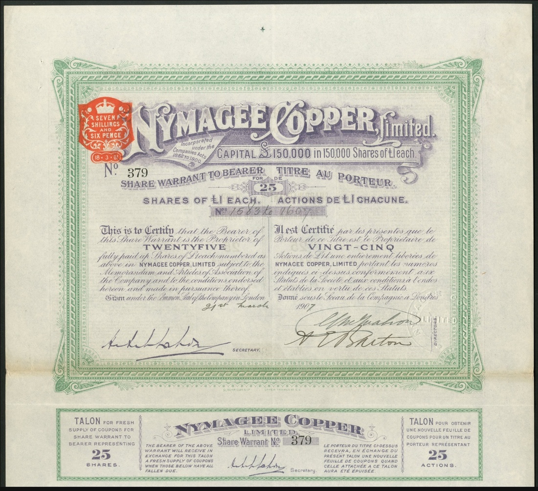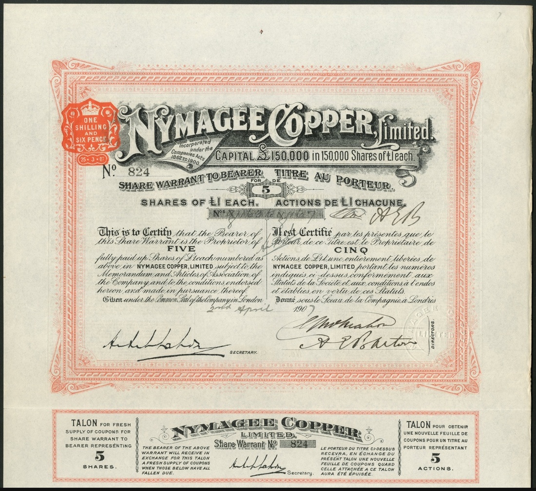 Australia: Nymagee Copper Limited, New South Wales, pair of certificates for 5 shares and 25 shares of £1, both 190[7], #824 and #379, ornate borders, red and green respectively, with coupons. EF (2).