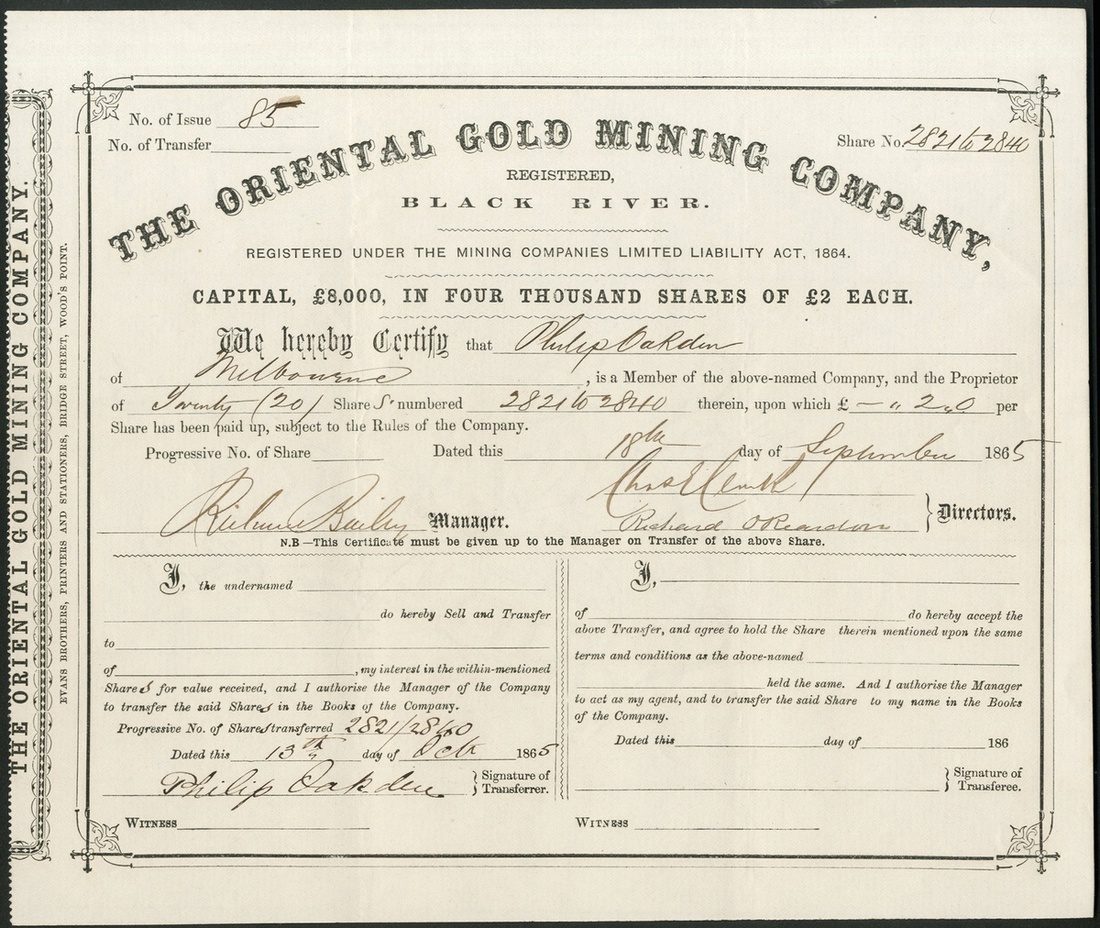 Australia: Oriental Gold Mining Company Reg'd, £2 shares, 186[5], #85, black. Mines at Black River, Victoria. Rare early piece in EF condition.
