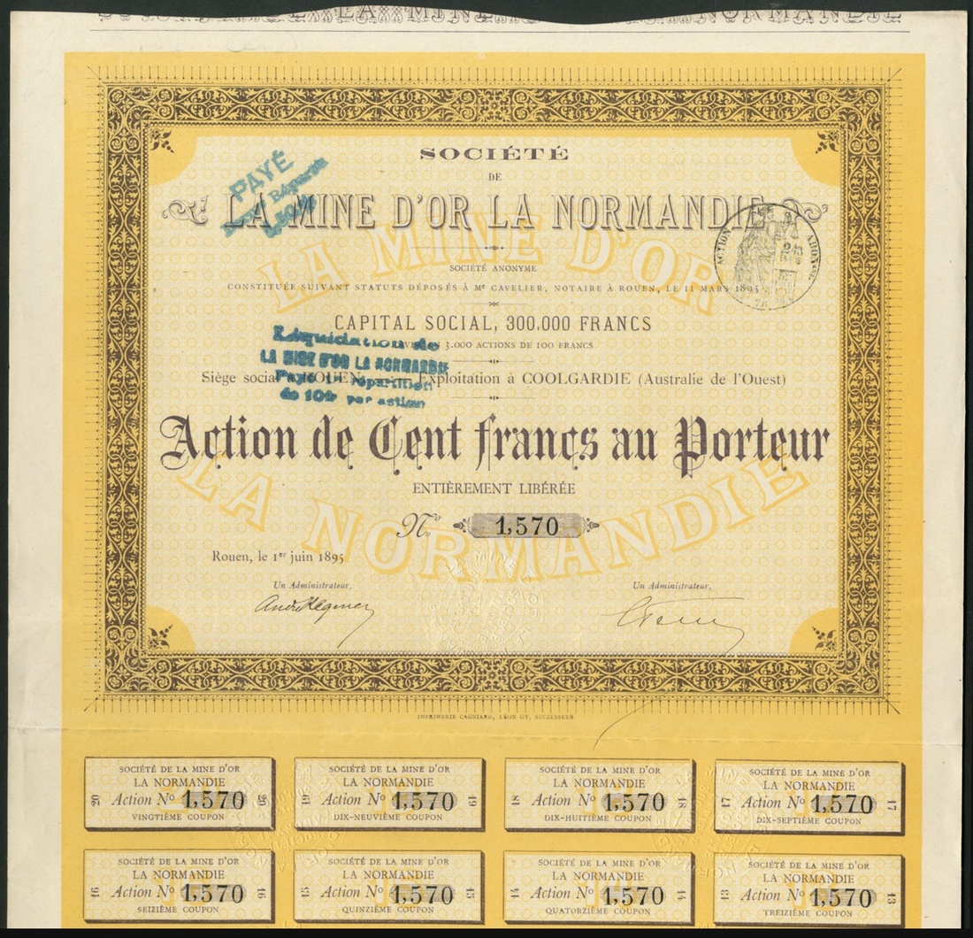 Australia: Societe de la Mine d'Or la Normandie, 100 franc share, Rouen 1895, #1570, ornate border, yellow and black, with coupons. Mines in Coolgardie, Western Australia. GVF.