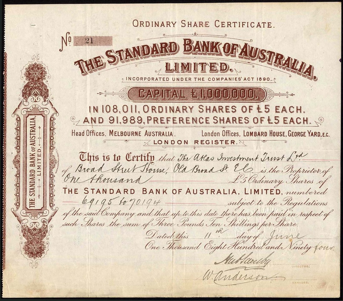 Australia: Standard Bank of Australia, £5 ordinary shares, £3 10s paid, 189[4], #21, issued to the Atlas Investment Trust for 1000 shares which was just under 1% of the company's ordinary capital, scrollwork at left, brown. A Melbourne based bank that got into financial difficulties during the banking crisis but struggled on for a few years. Suspended payments in 1893 with the hope of a reconstruction which was opposed by many creditors. AVF and rare..