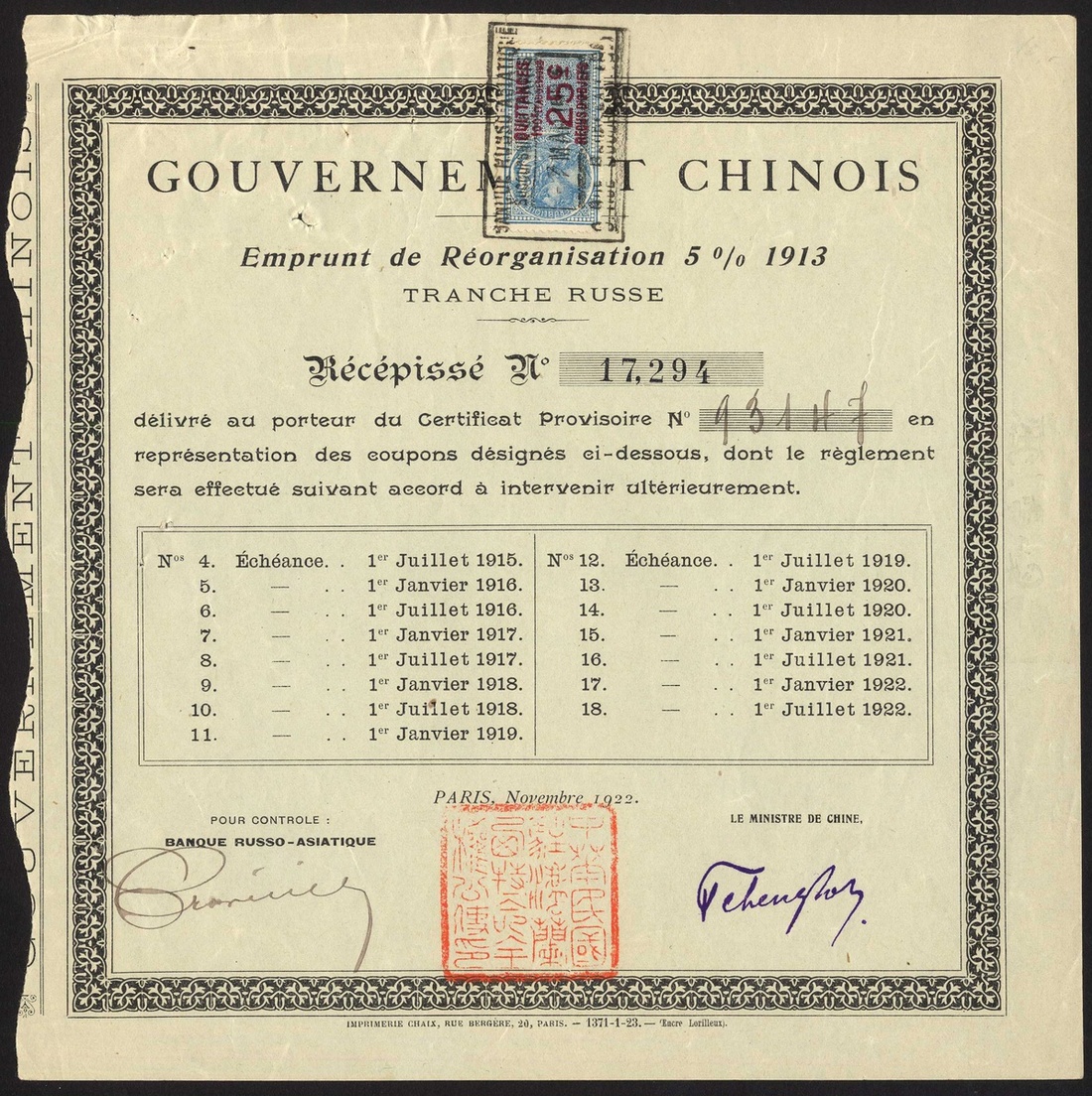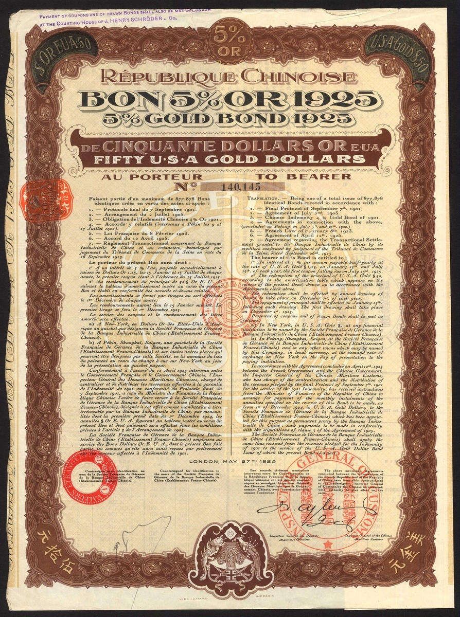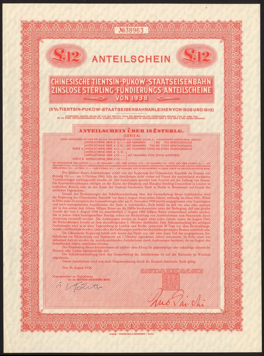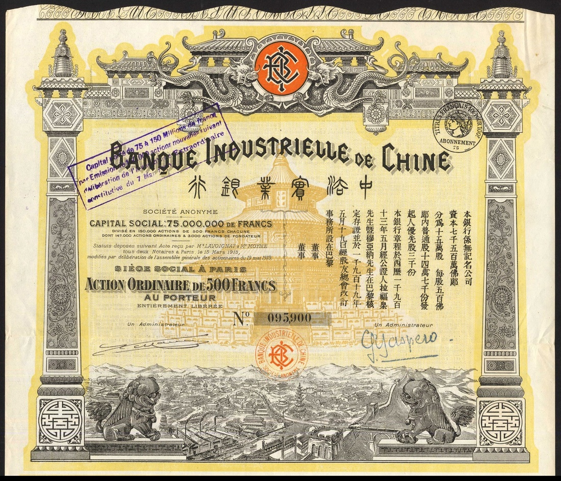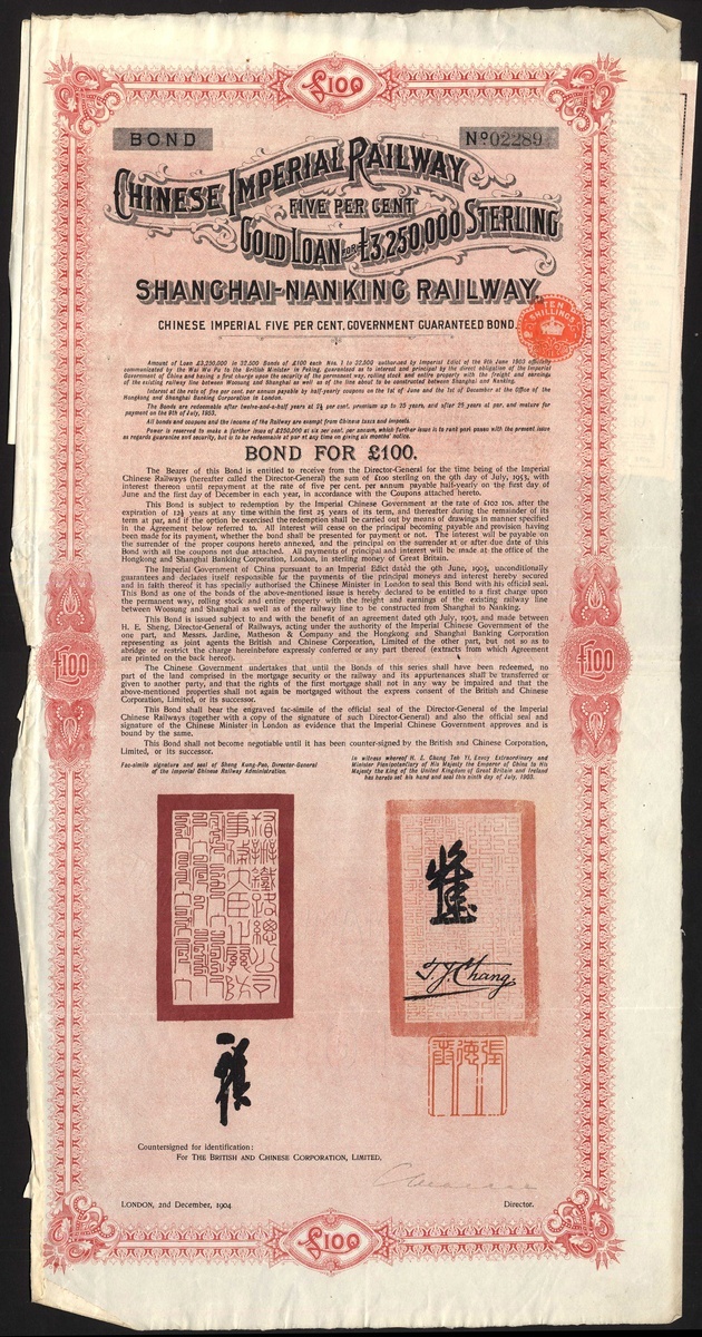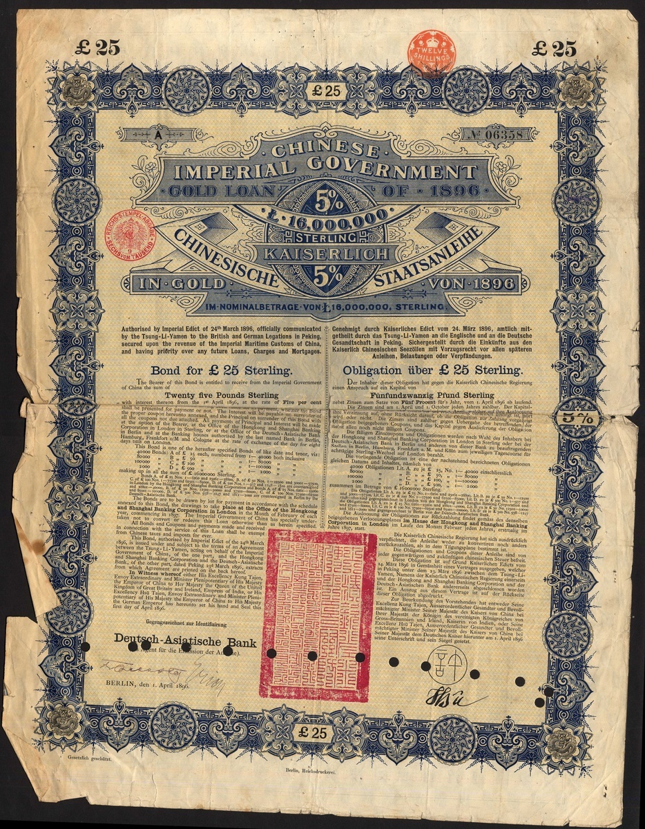 China: A Miscellaneous group of certificates, comprising 1896 5% Gold Loan, £25 bond, cancelled; Shanghai-Nanking Railway, 5% Gold Loan, 1904, £100; Reorganisation Loan, receipt for coupons issued 1922 following the collapse of the Russo Asiatic Bank; 1925 5% Gold Loan, $50 bond; 1938 Tientsin Pukow Railway 'anteilschein' for £12, and lastly Banque Indusrielle de Chine, 500 franc shares, capital 45 million, 1913 and capital 75 million, 1919 (2 examples). Mixed condition. Fair to VF (8).