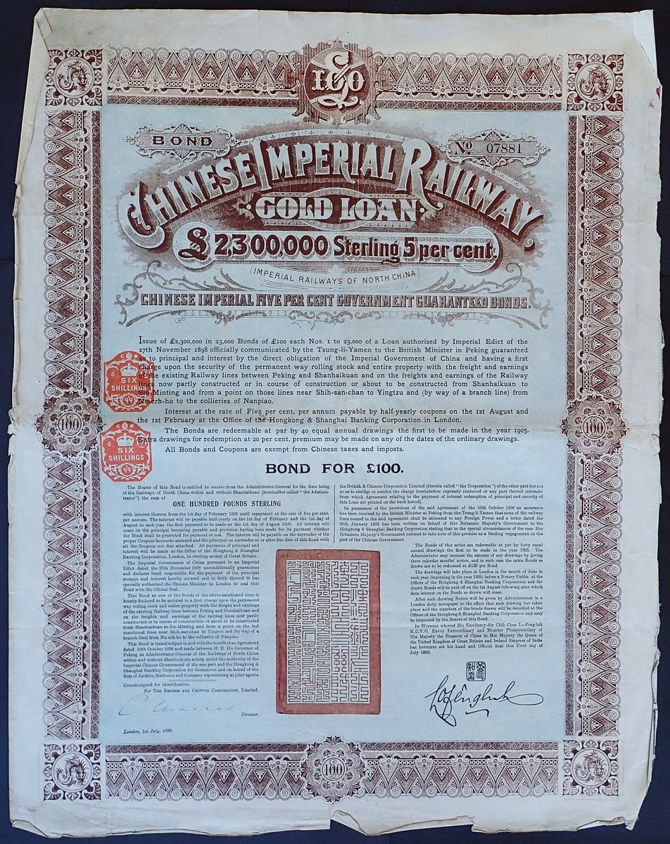 China: 1899 Chinese Imperial Railway 5% Gold Loan, £100 bond, #07881, large format, ornate border, brown with pale blue underprint, red 'chop' in centre, with coupons. A few small edge tears and coupons becoming separated otherwise VF and clean.