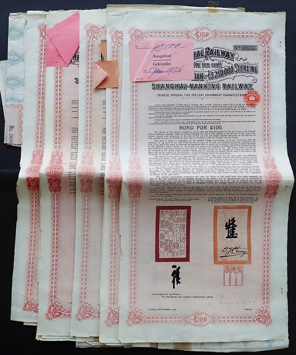 (x) China: Shanghai-Nanking Railway 5% Loan, a group of 10 bonds for £100, 1st issue, 1904, large format, red and black, with coupons. VF-AEF (10).