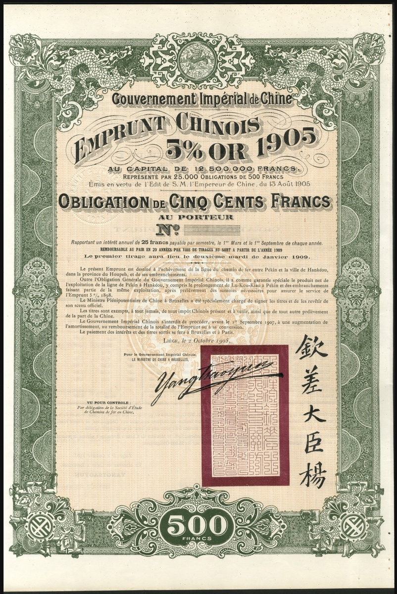 China: "Emprunt Chinois" 5% Gold Loan 1905, unissued bond for 500 francs, large format piece with ornate borders, dragons at top, green and black, beige underprint, with full coupon sheet. Centre fold otherwise EF.