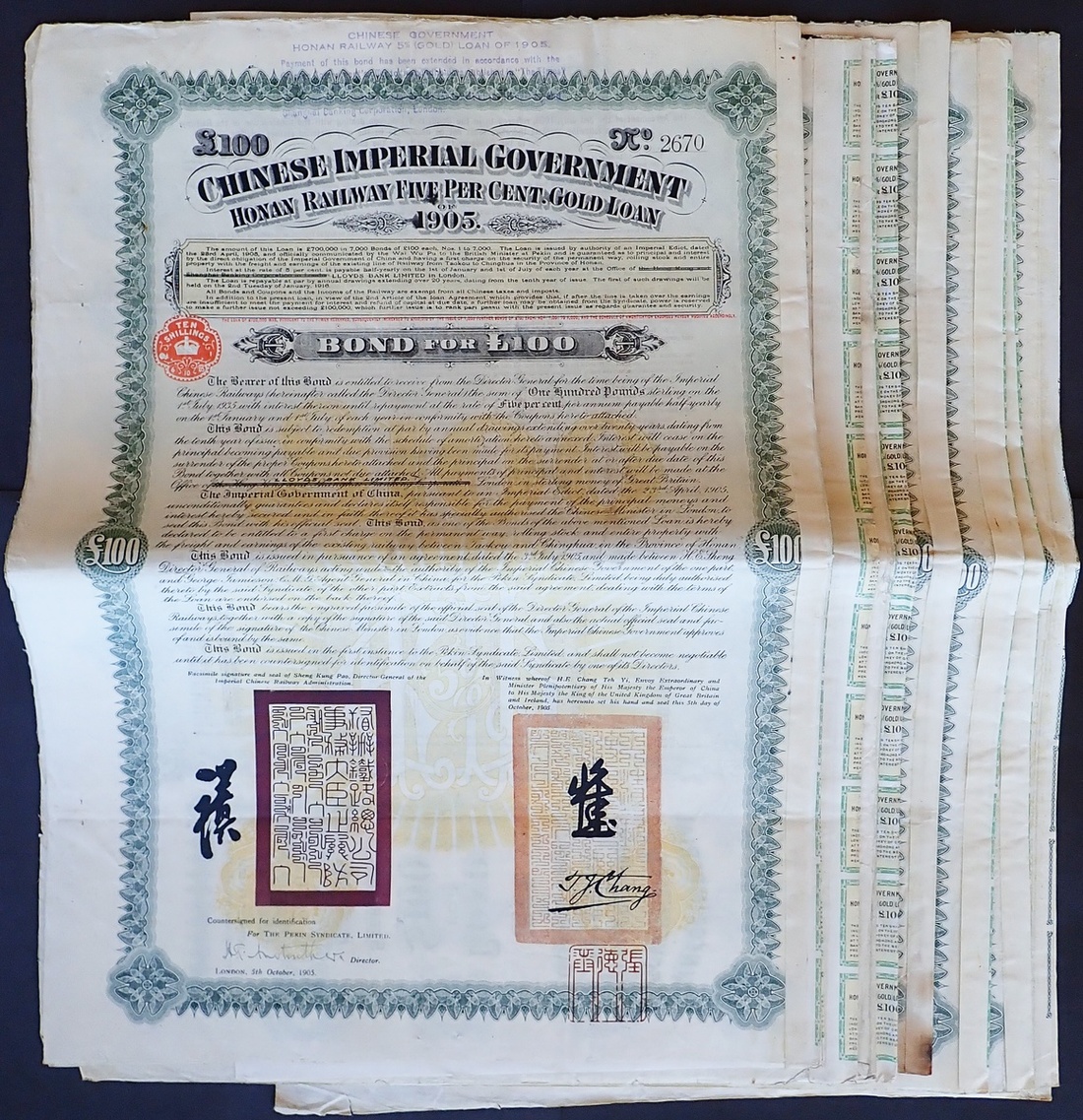 (x) China: 1905 5% Honan Railway Gold Loan, a group of 10 bonds for £100, 1st issue, large format, ornate border, green and black with yellow underprint, with coupons. Pinholes but generally VF and better (10).